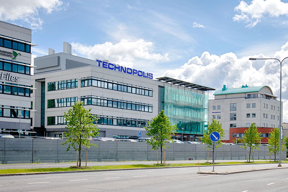 Technopolis Hermian päärakennus. Moderni toimistotalo, jossa Hermian vuokralaisia palvelee mm. aulapalvelu ja lounasravintola.