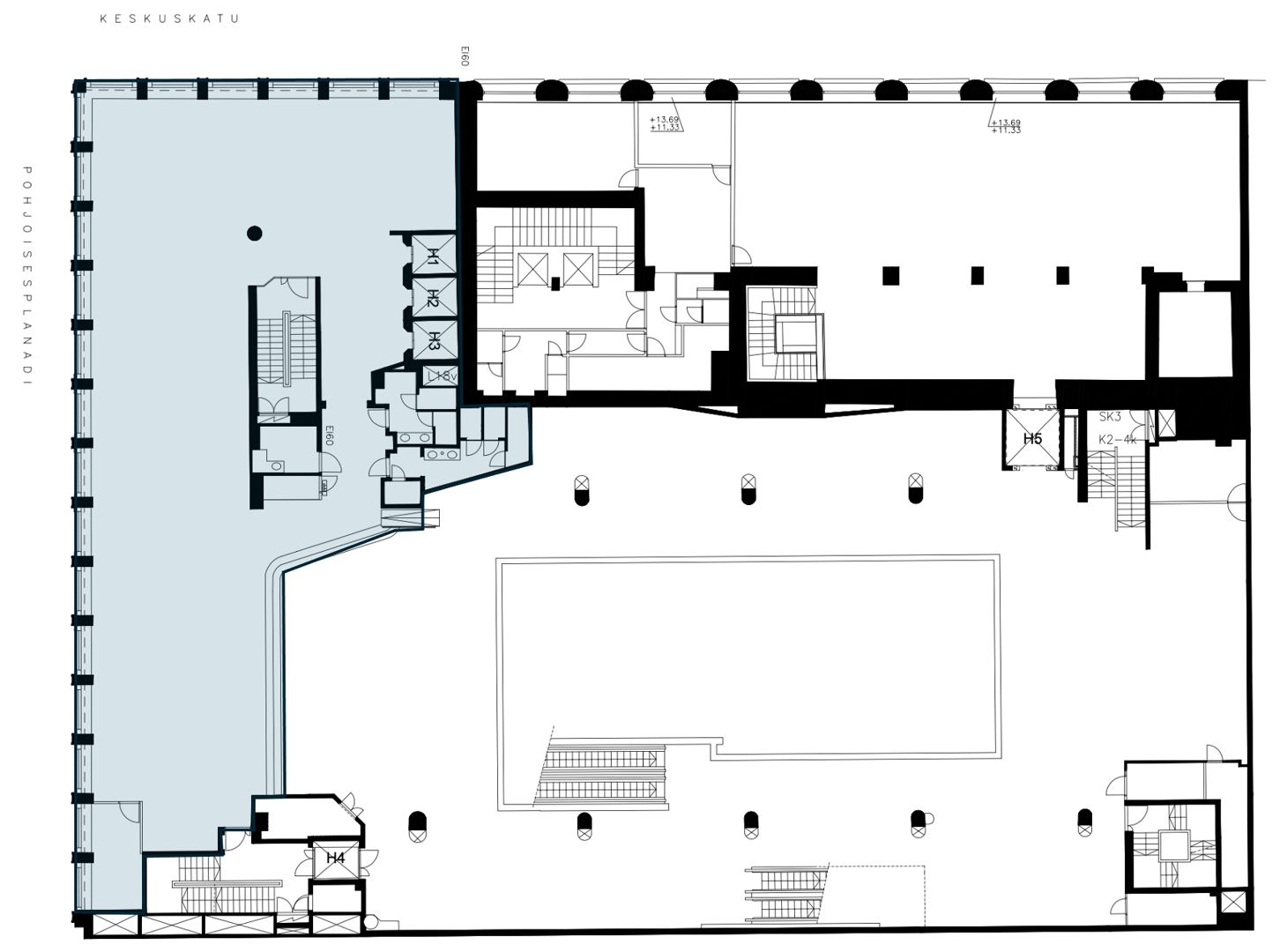Kirjatalo. Alvar Aallon 60-luvulla suunnittelema rakennus sijaitsee Helsingin kaupallisen keskustan ytimessä Keskuskadun ja Pohjoisesplanadin kulmassa, Stockmannin tavarataloa vastapäätä. Rakennuksessa on kolmikerroksinen, alun perin kirjakaupaksi suunniteltu osa, jonka kahdessa ensimmäisessä kerroksessa toimii edelleen Akateeminen Kirjakauppa sekä Starbucks kahvila ja kolmannessa kerroksessa Co-working tila. Osalle tätä kolmikerroksista rakennusta on toteutettu kuusikerroksinen toimisto-osa, jossa toimistotiloja on kolmannesta kerroksesta ylöspäin. Toimisto-osaan kulku tapahtuu kävelykaduksi toteutetun Keskuskadun sisäänkäyntiaulan kautta, josta toimistokerrokseen pääsee kolmella asiakashissillä.