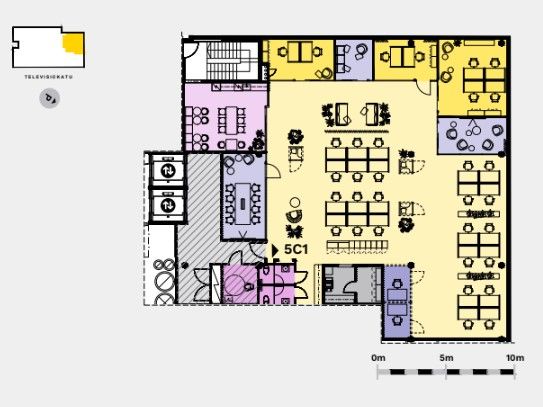 Tehokas noin 30 työpisteen toimistoratkaisu (5C1), jossa avotilan lisäksi on useampi vetäytymistila sekä yksi neuvotteluhuone. Tila on moderni ja valmis.