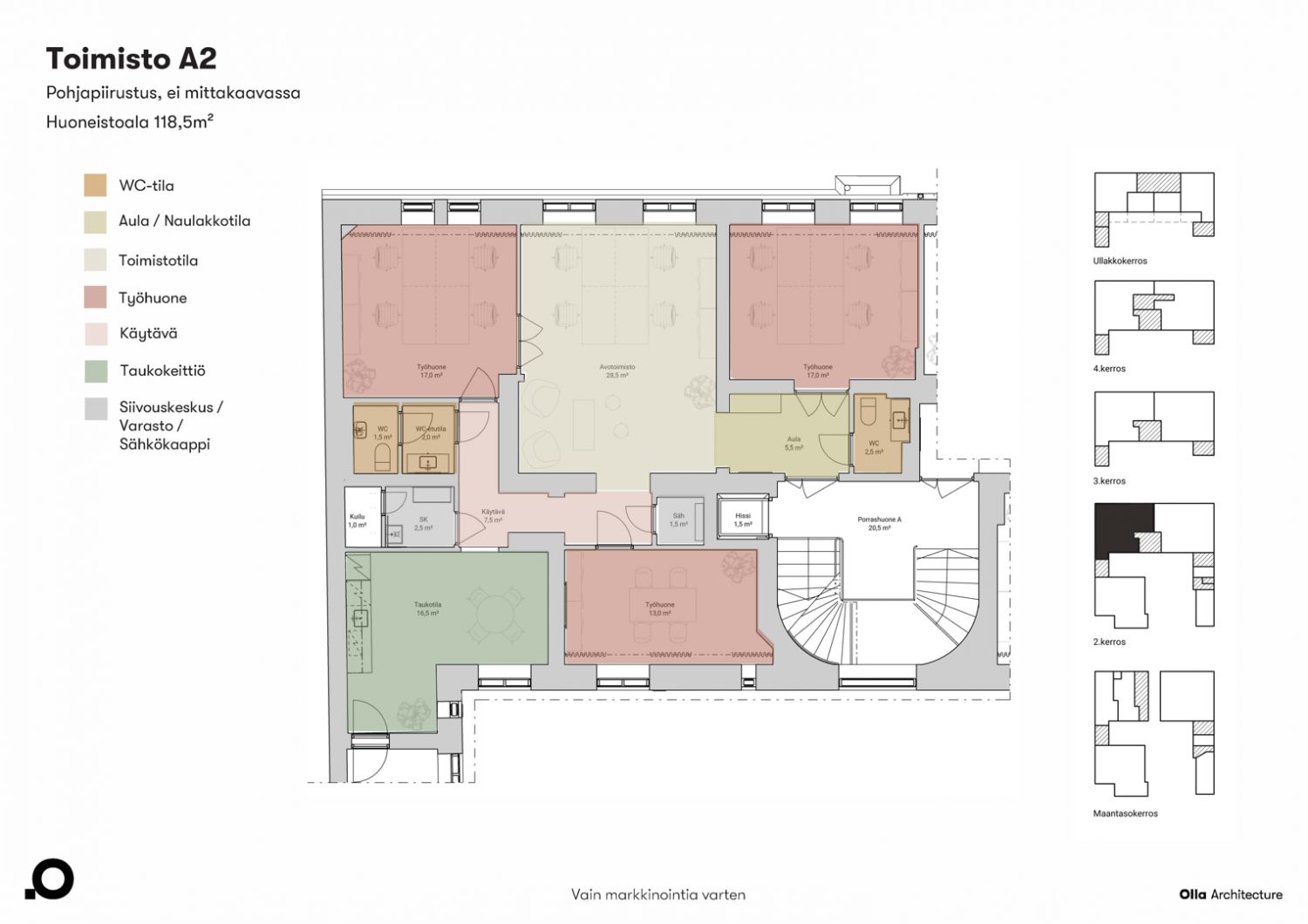 Vuokrattavana 2. kerroksen 118 m2 toimistotila. Rakennus valmistunut peruskorjaukseseta 2025. Kaikki tilat remontoitu vanhaan tyyliin ja niissä parkettilattiat. Painovoimainen ilmanvaihto.