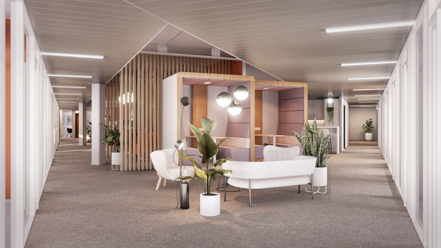 Havainnekuvat ovat taiteilijan ehdotuksia tilojen sisustuksesta. Suunnittelemme tilojen lopullisen toteutuksen aina asiakkaan tarpeiden ja toiveiden mukaan. Tässä kohteessa sinulla on erityisen hyvät mahdollisuudet vaikuttaa tilaratkaisuihin toivotpa sitten avointa tilaa tai rauhallisia työskentelysoppia.