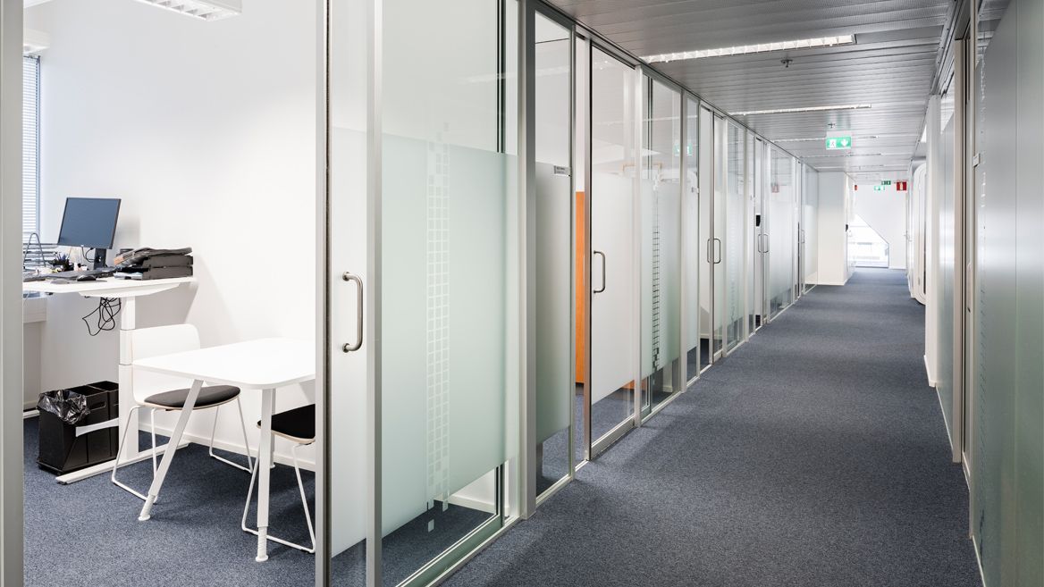 Muuntojoustava 1. kerroksen toimistotila, jossa korkea huonekorkeus n. 3,5 m.