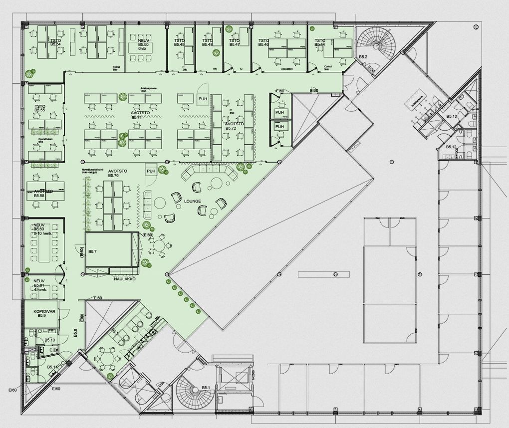Tehokas ja viihtyisä toimistotila n. 15 - 60 työpisteelle. Valmiiksi remontoitu tila, jota mahdollista muokata käyttäjän toiveiden mukaan.