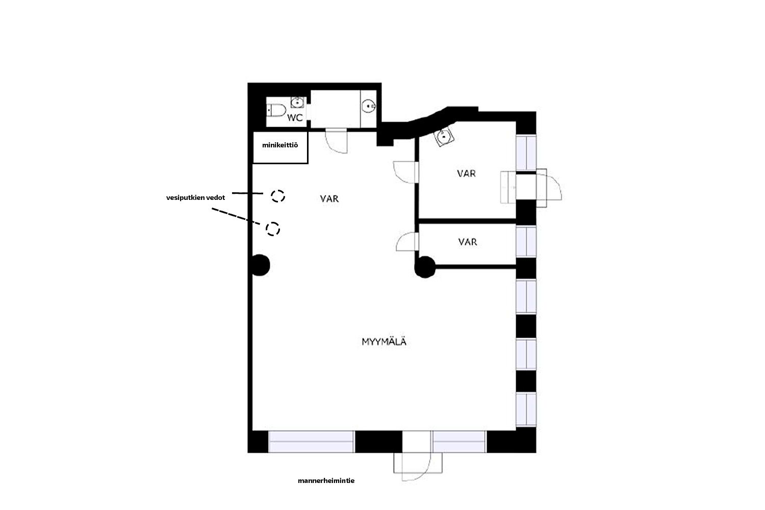 Huoneistoon kaksi sisäänkäyntiä ja tila on pinta-alaltaan 72-neliöinen. Sisätilassa normaali huonekorkeus. Tilan etuosa on pääosin avointa tilaa ja siinä on laattalattia, jossa lattialämmitys. Takaosassa on kaksi pienempää huonetta (sopii hyvin esim. varastoiksi), minikeittiö, pesupisteet (kampaamon käytössä olleet) ja wc. Pääsisäänkäynnin molemmin puolin on isot näyteikkunat suoraan Mannerheimintielle päin, taatusti hyvä näkyvyys ja kaupallinen sijainti nyt sekä tulevaisuudessa!