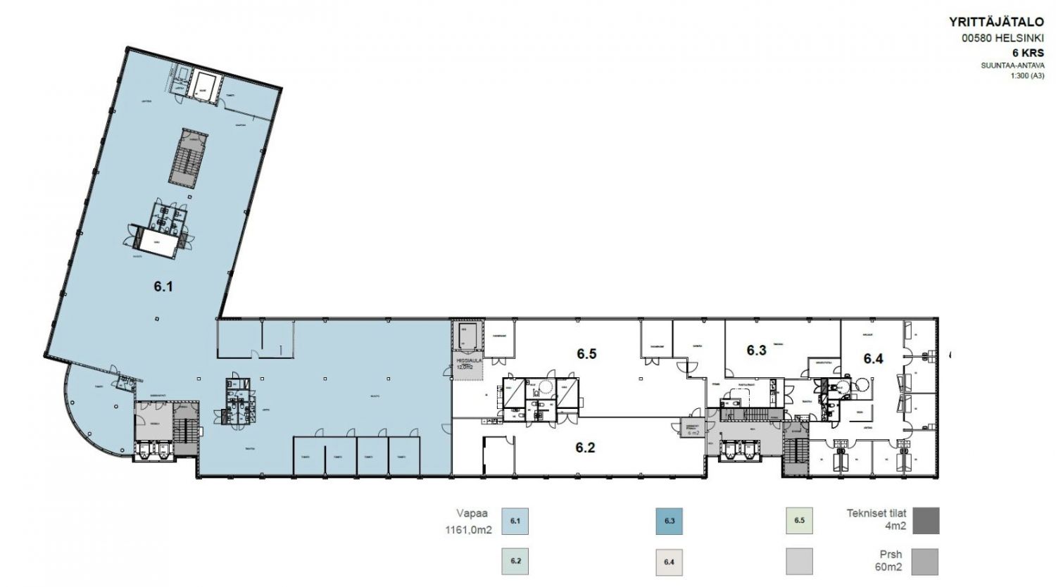 Vuokrataan kuudennen kerroksen 1161 m² toimitila Kalasatamasta. Soveltuu toimisto, showroom tai varastotilaksi. Paljon avotilaa ja muutamia huoneita. Korkeaa tilaa n. 60m2 alueelta sisääntulon edessä. Tilassa on epoksimaalattu lattia, uusittu valaistus ja wc:t. Tilassa on myös keittiö sekä tilaan tulee tavarahissi
