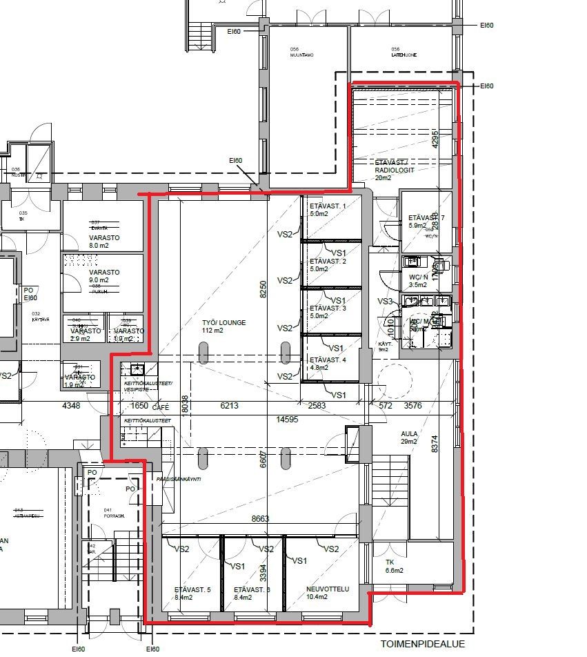 Vuokrattava pinta-ala on n. 244 jyvm2. (pohjakuvassa punaisella rajattu alue)