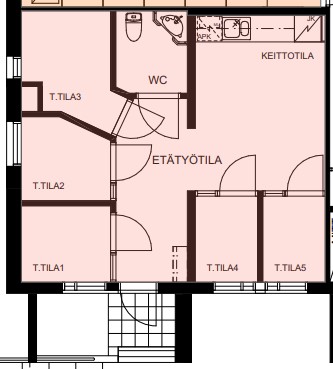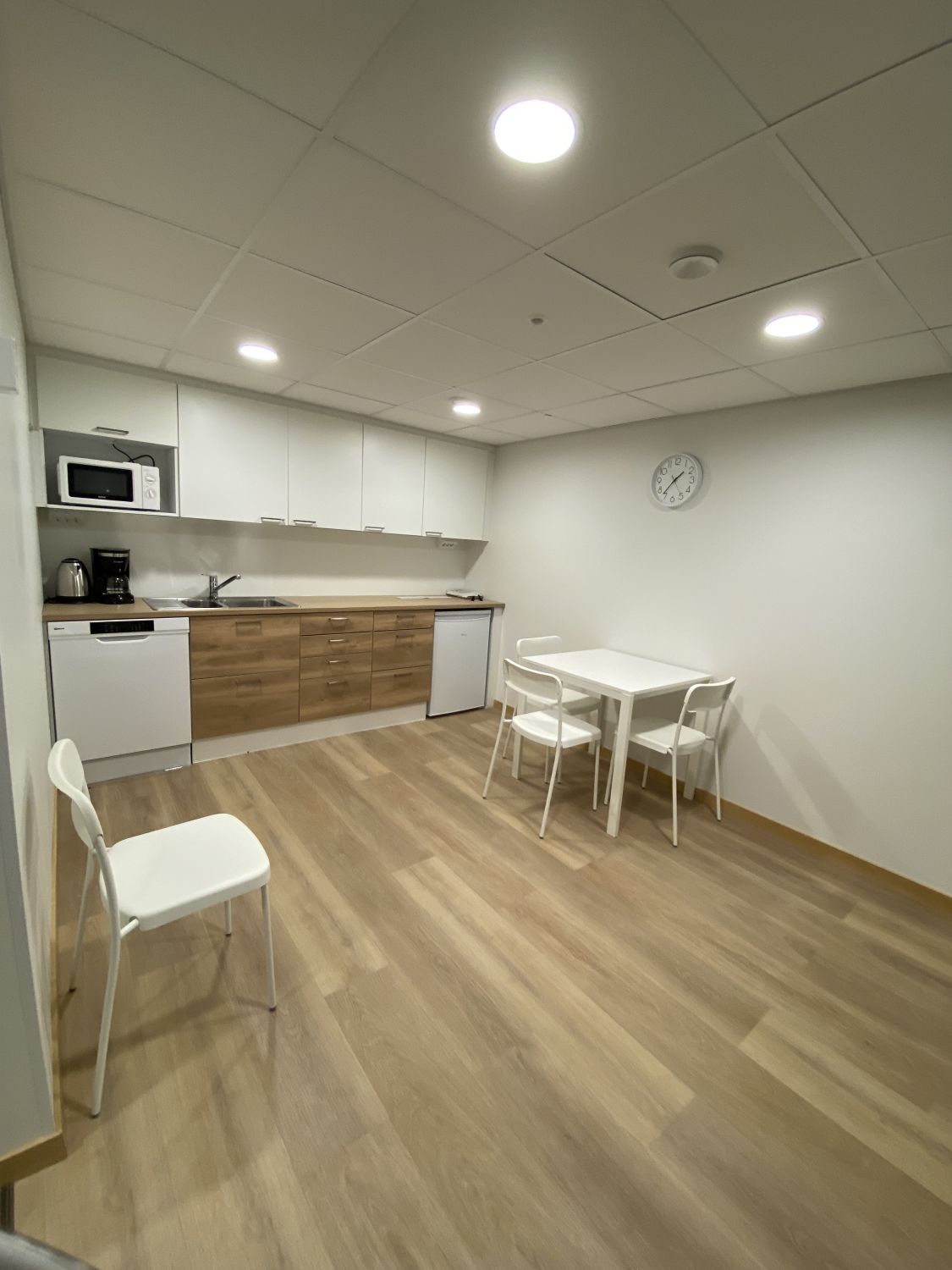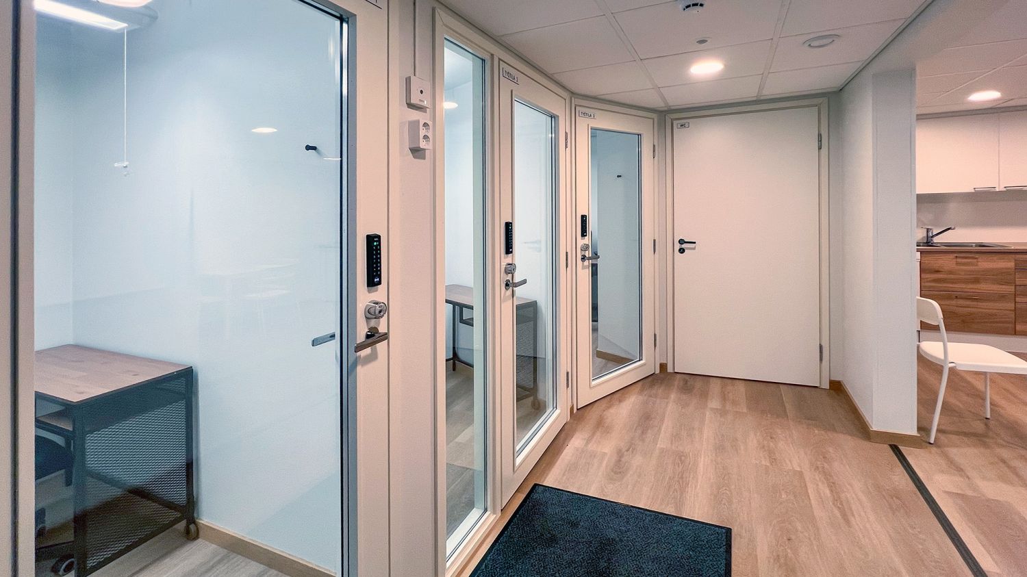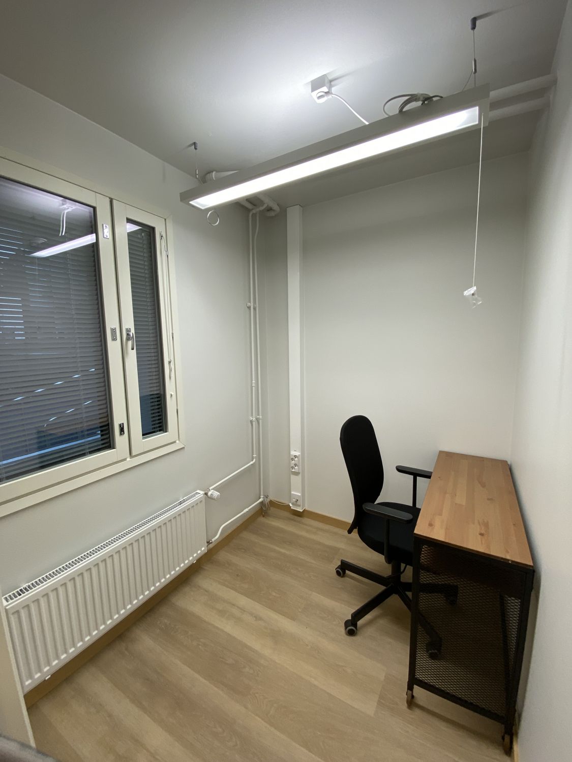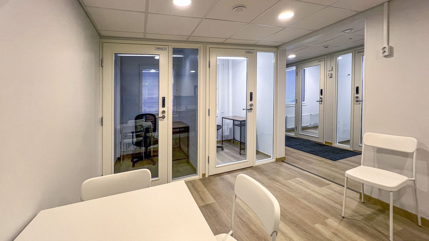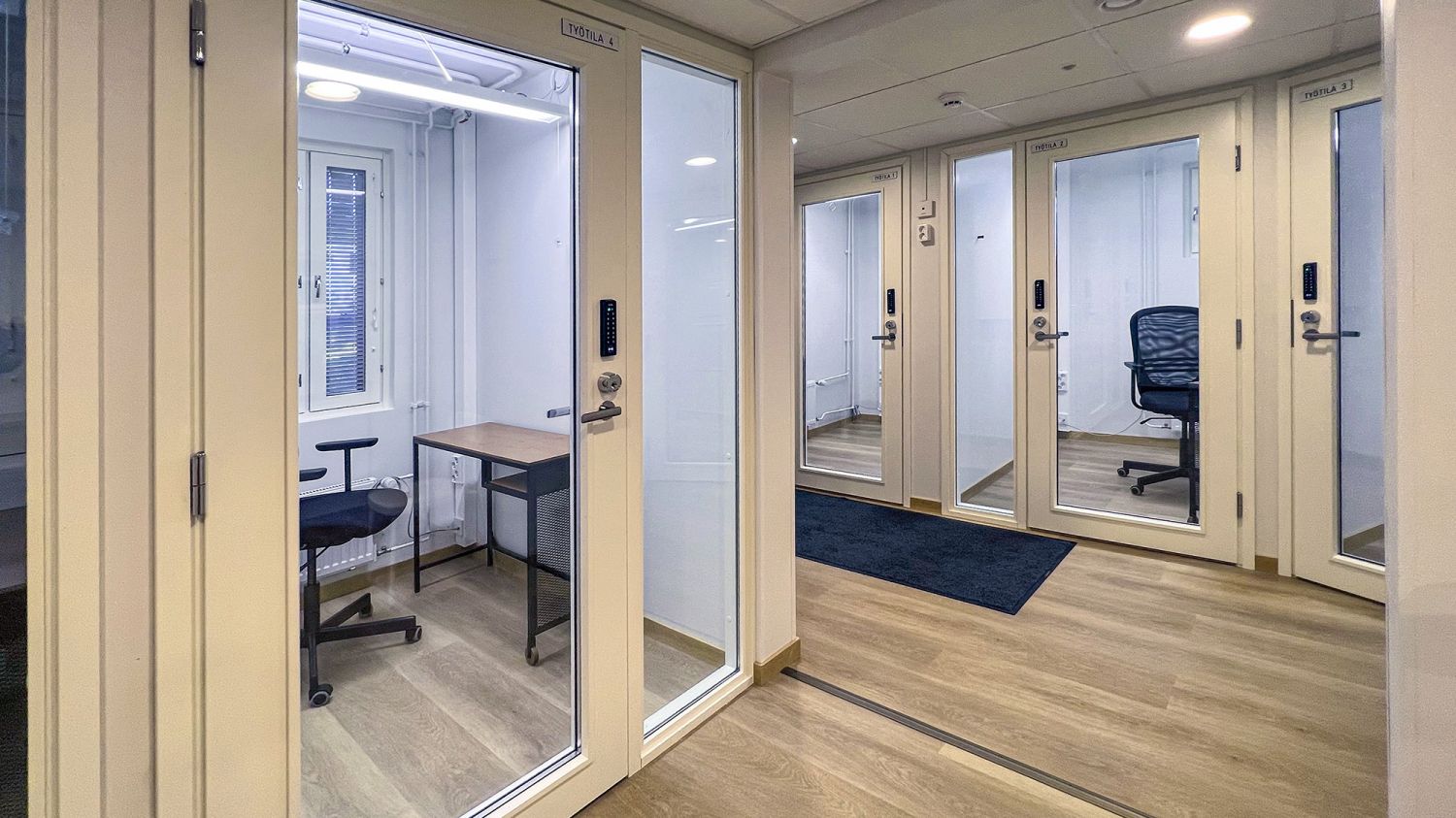 Työtila käsittää viisi erillistä, erikseen lukittavaa ja kalustettua työhuonetta, keittiön ja wc:n. Keittiössä on valmiina ruokapöytä ja tuolit, mikroaaltouuni, astianpesukone, kahvinkeitin ja vedenkeitin. Vuokrattavissa oleva työtila on täysin uusi, sillä kiinteistö valmistui peruskorjauksesta kesällä 2025. Lämmitys, vesi, viemäri, wc sekä normaalikäytössä oleva sähkö sisältyy vuokraan.
