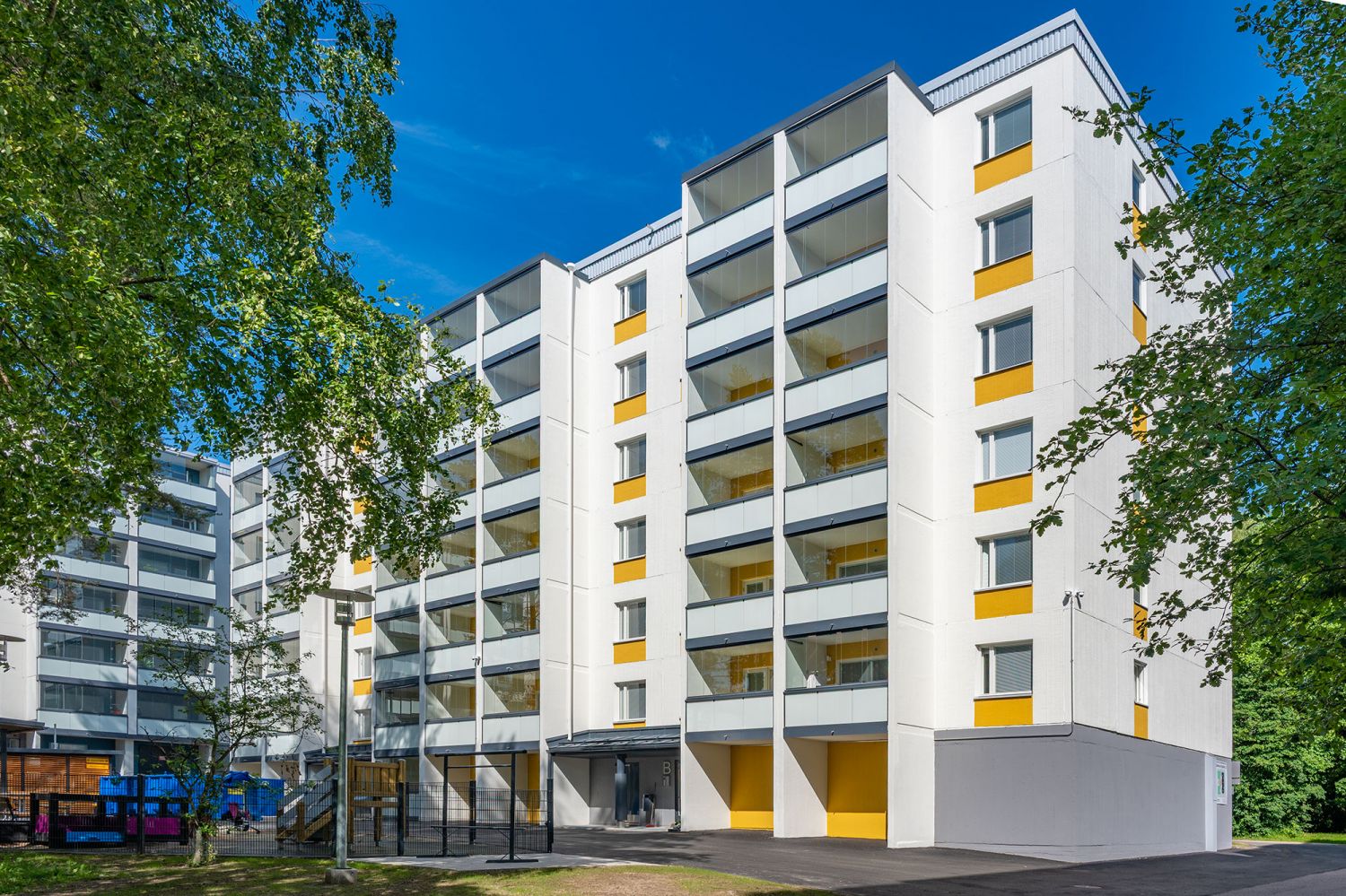 Killan vehreällä alueella sijaitseva kerrostalo, jossa pohjakerroksessa vasta täysin remontoitu työ- tai toimistotila vuokrattavana.