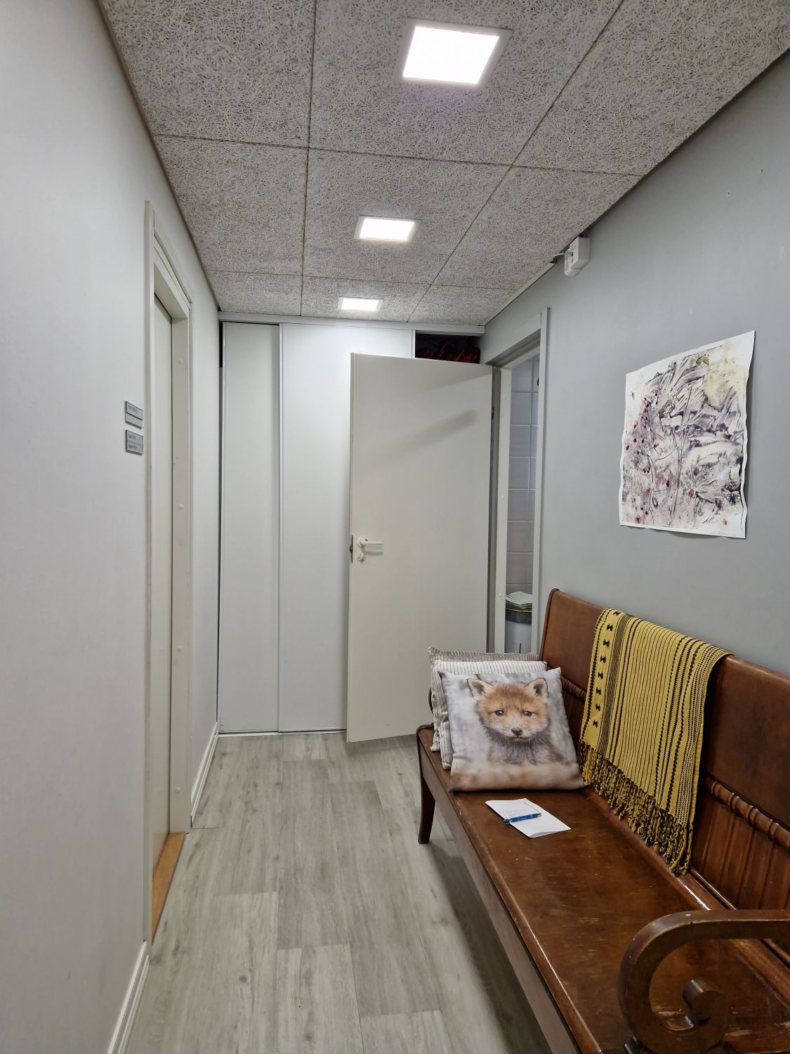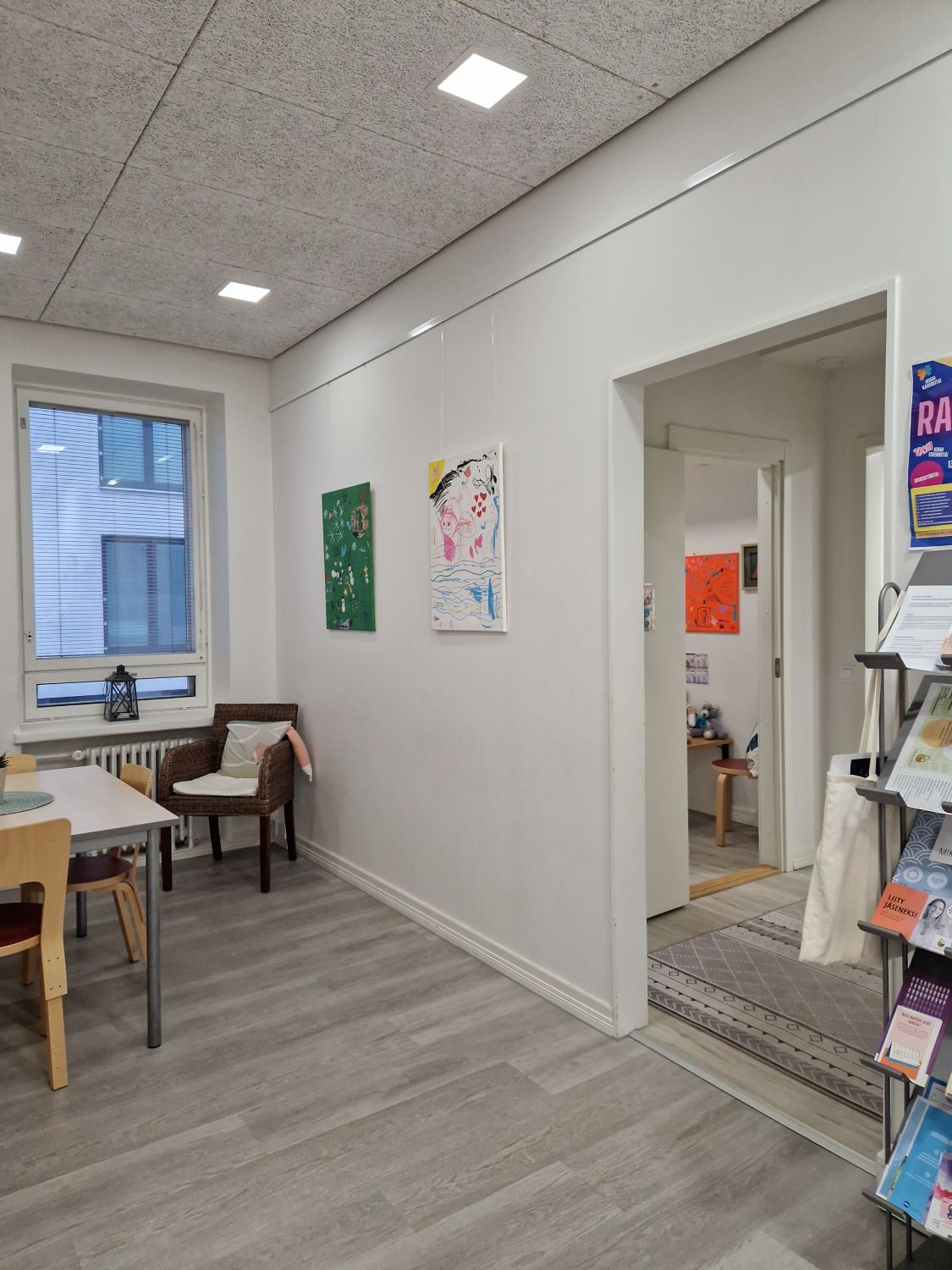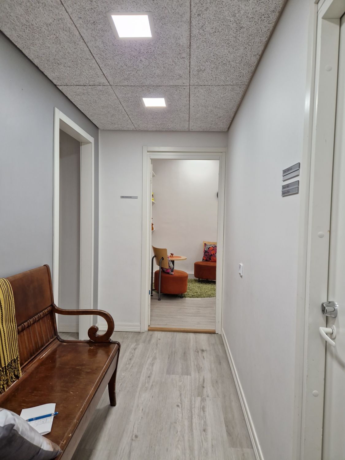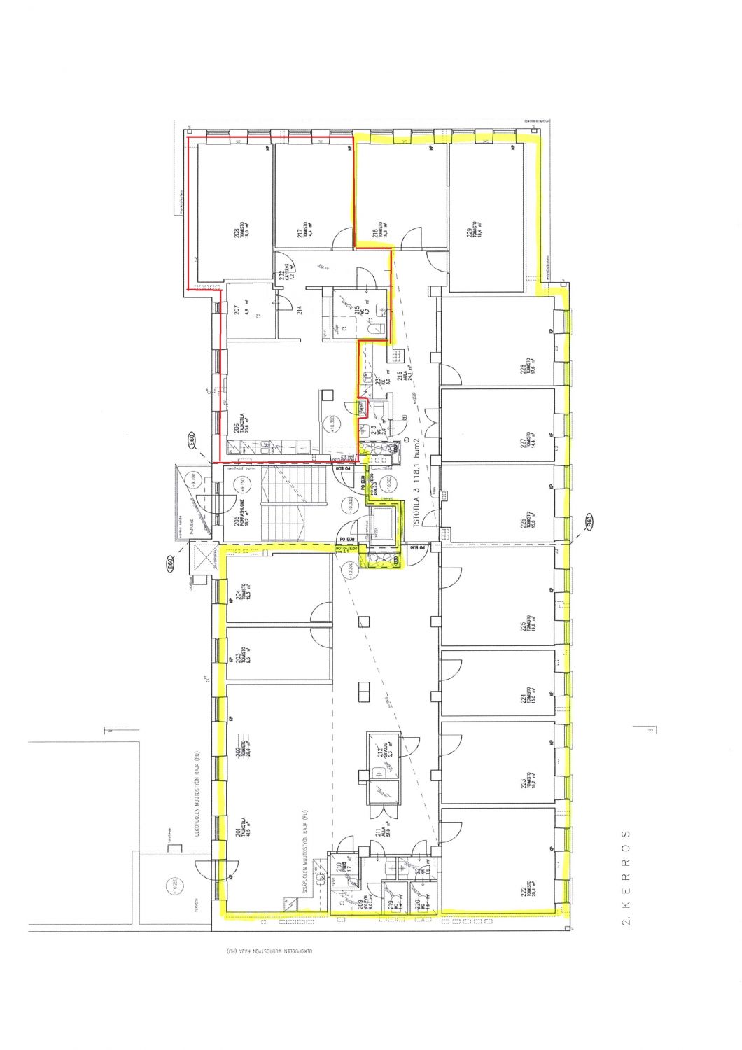2. kerroksen huoneistossa on 2 työhuonetta, neuvottelu/taukotila, varasto ja wc suihkulla. Vinyylilankkulattiat.