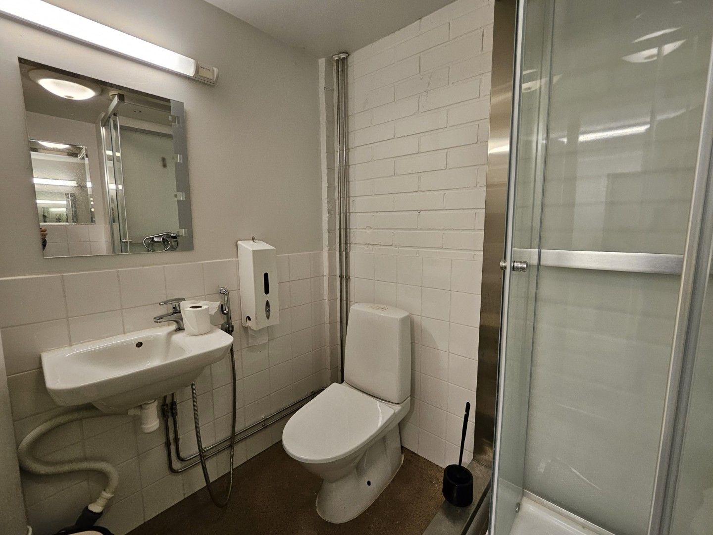 Toimitilassa on wc ja suihku sekä käytössä on vielä erillinen wc-tila, joten kokonaispinta-ala on n. 204 m².