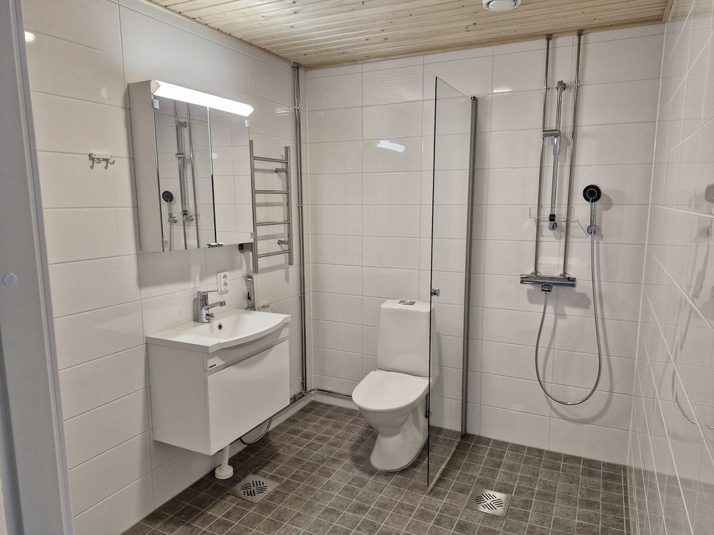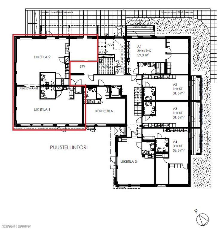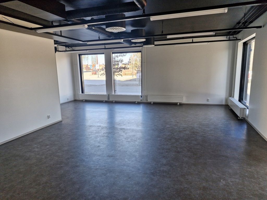 Tämä valoisa 82,5 m² liiketila sijaitsee kiinteistön katutasossa. Tila on avara ja siihen kuuluu oma keittiöpiste ja wc-tila, jossa on myös suihku. Tila on pohjakuvassa Liiketila 2.