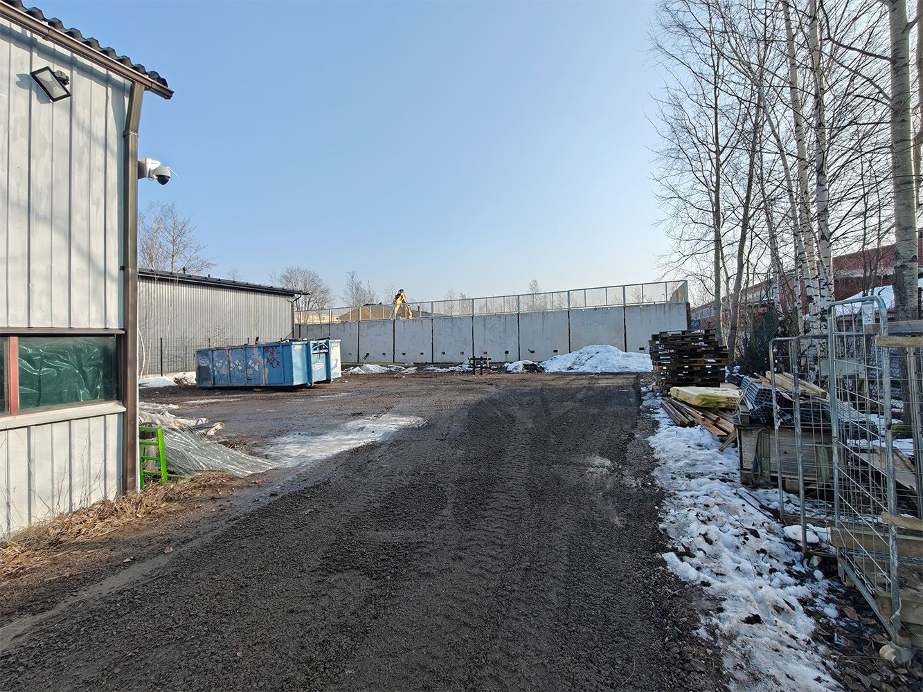 Iso piha-alue, jossa runsaasti tilaa esim. konteille ja autoille. Rakennus ei ole ympäriajettavissa, mutta piha-alue on aidattu.