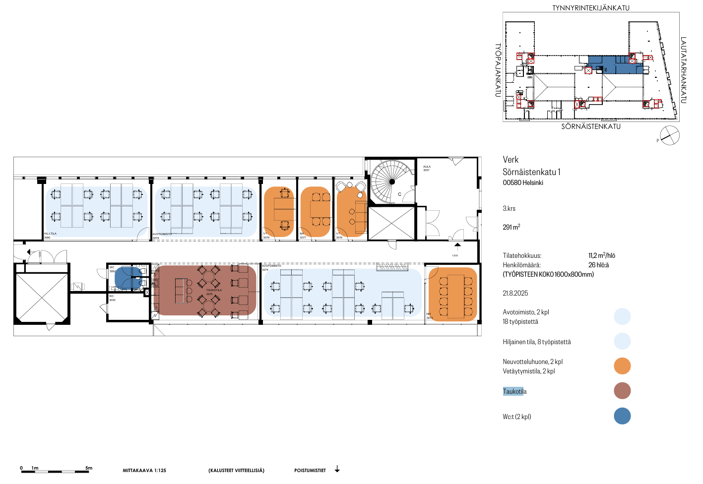 Kokonaisuus on 291 m² kolmannessa kerroksessa ja sopii erinomaisesti esimerkiksi 10-26 hengen tiimille. Tilatehokkuus on erinomainen: 11,2 m²/hlö. Työpisteiden koko on luonnoksessa 1600 x 800 mm. Ratkaisu sisältää:
