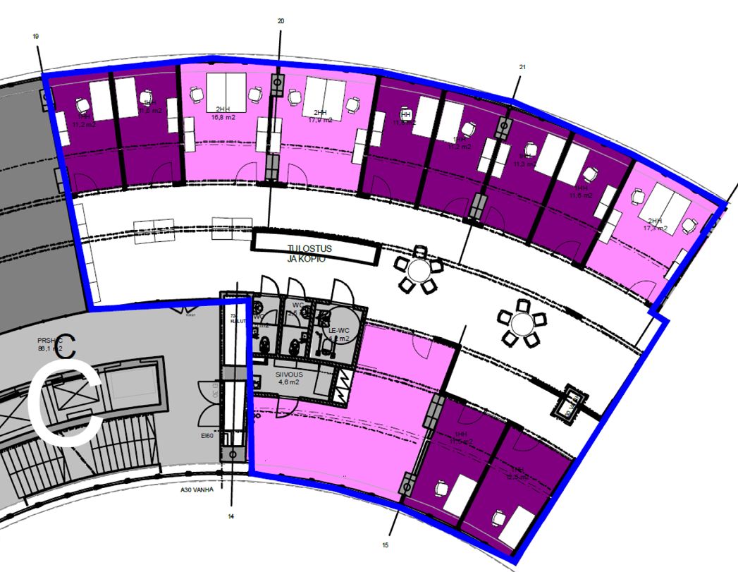 Tila räätälöidään täysin asiakkaan tarpeiden mukaan ja voidaan myös jakaa pienempiin kokonaisuuksiin. Kokonaispinta-ala on 325,5 m², ja se soveltuu noin 25 hengen tiimille. Tilassa on erikokoisia huoneita, avotilaa sekä kaksi WC:tä ja yksi LE-WC, mikä lisää käyttömukavuutta ja esteettömyyttä.