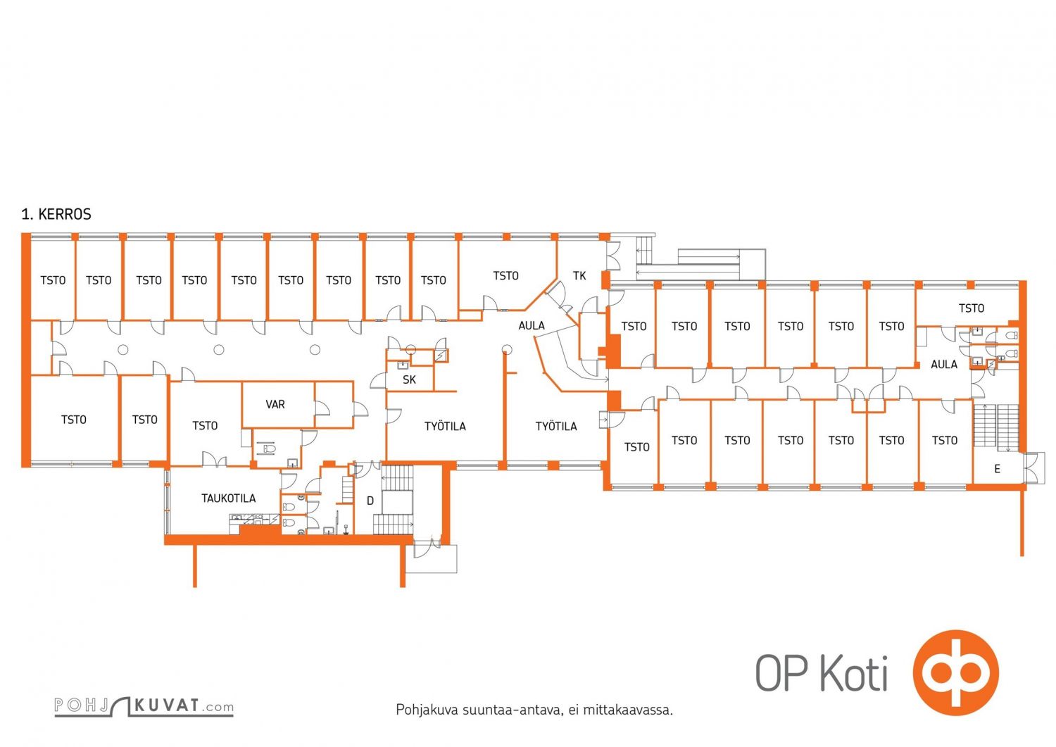 Tila on jaettavissa. Tilat koostuvat erillisistä toimistohuoneista, taukotiloista, varastotiloista ja wc-tiloista, joita voidaan muokata tarpeen mukaan