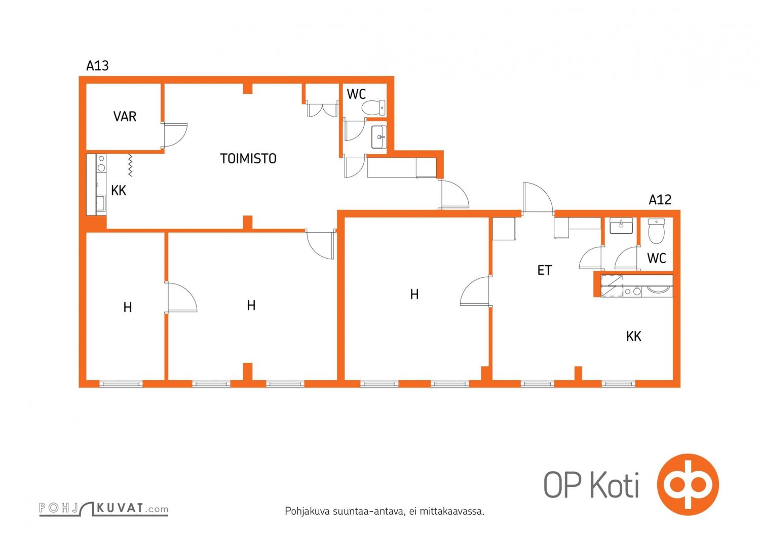 Tila on jaettavissa. Tilasta on mahdollisuus vuokrata myös erikseen joko 69 m2 tila (4h+kk+wc) tai 43 m2 tila (2h+kk+wc)