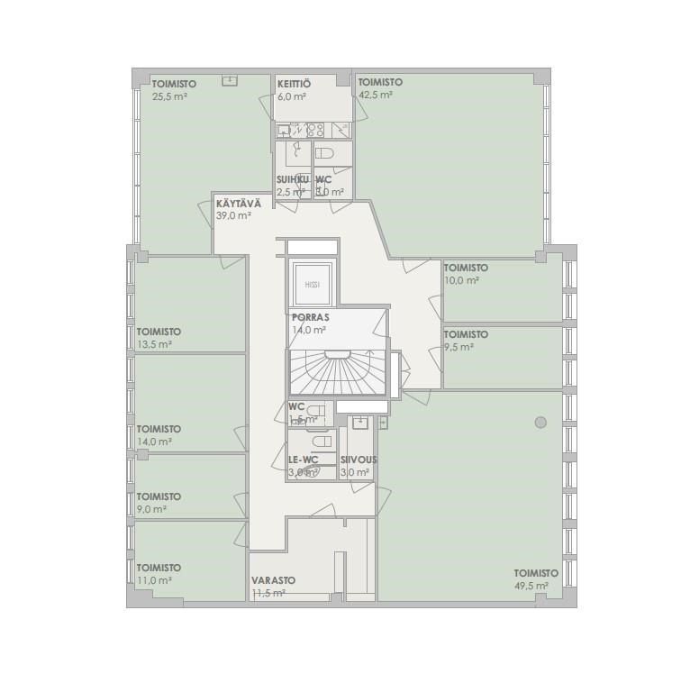 Keskeisellä paikalla, hissitalossa toimiva ja erittäin hyväkuntoinen toimistotilakokonaisuus, pohjakuvan mukaisesti erillisiä huoneita 9 kpl, joista kaksi salimaista suurta tilaa (42 ja 49 m2). Soveltuu hyvin esim. kuntoutustoimintaan, toimistoksi ym. Osassa huoneista myös vesipisteet. Inva wc Sovi esittely, heti vapaa tila.