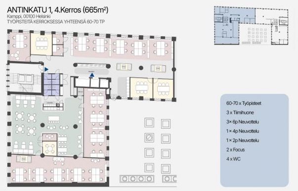 Vuokrataan 4. kerroksen erittäin valoisa, industrial henkinen toimistotila huippusijainnilla Kampissa. Tehokas pohjaratkaisu mahdollistaa joustavat tilaratkaisut vuokralaisen tarpeen mukaan. Yhteisöllisyyttä lisäävä keittiö/ruokailutila, erikokoiset neuvotteluhuoneet ja monimuotoiset työskentelytilat luovat pohjan toimivaan hybridityöhön. Tilasta on kulku sisäpihalle, jossa on oma terassialue tämän vuokralaisen käyttöön. Tilaan tulee myös tavarahissi. Tila on mahdollista yhdistää alemman kerroksen tilaan, jolloin vuokrattavia neliöitä on yhteensä 2148 m2.