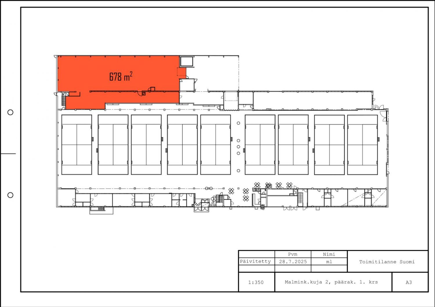 Vuokrataan 678 m² lämmin tuotanto-/varastotila rakennuksen ensimmäisestä kerroksesta. Tilan korkeus kattopalkin alareunaan 3,8-3,96 m ja kapeassa osassa 3 m. Nosto-ovi, ajoaukon leveys 2,5 m ja korkeus 3,1 m. Tilassa on voimavirta ja led-valaistus. Tilan ulkopuolella on reilun kokoinen katostila, jota voi käyttää lastaus- ja purkualueena.