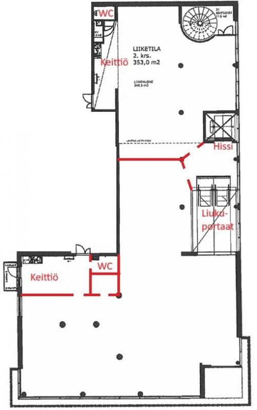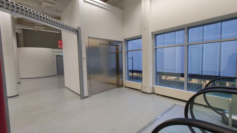Kulku 2. kerrokseen liukuportailla, hissillä tai rappusia. Sisäänkäynti rappukäytävän tai alakerroksen liiketilan kautta.