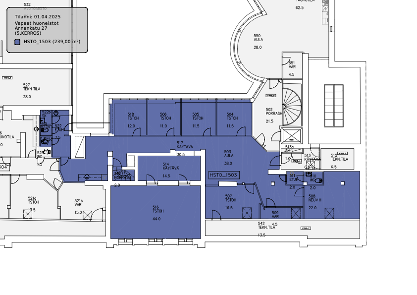 Tyylikäs 5. kerroksen toimistokokonaisuus Annankadulta. Tilaan kuuluu 239 m² toimisto sekä 6. kerroksen 60 m² neuvottelutilan sisältävä torni.