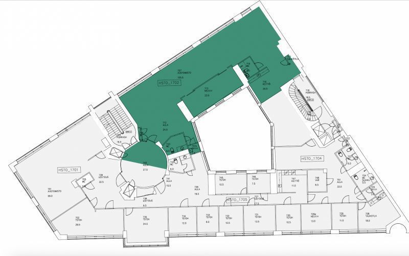 7. kerroksen avotoimisto Vuorikadun puolella. Huoneistossa on avotilan lisäksi erillinen neuvottelutila sekä omat keittiö- ja wc-tilat