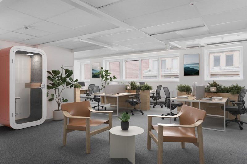 Moderni avotilasta ja muutamasta huoneesta koostuva toimisto.