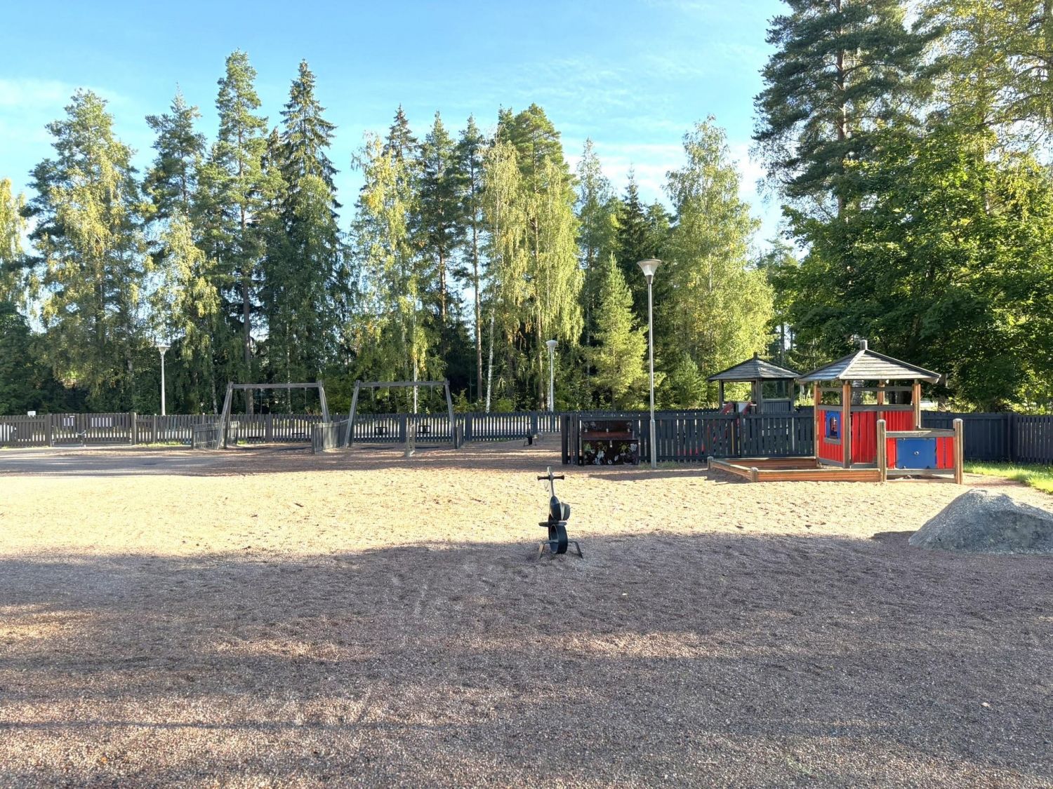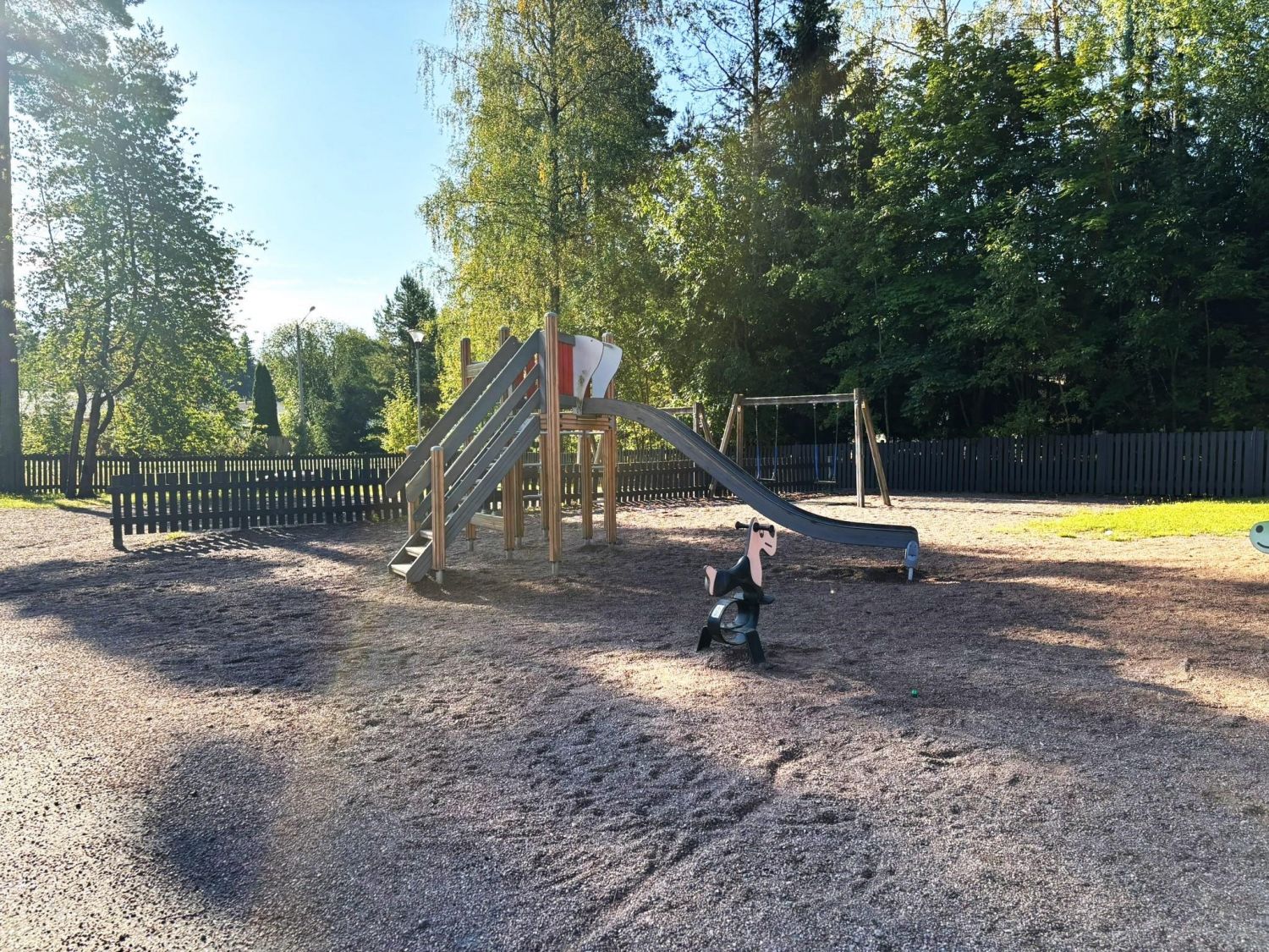 Tontilla aidatut lasten leikkipaikat, sekä grillikota.
