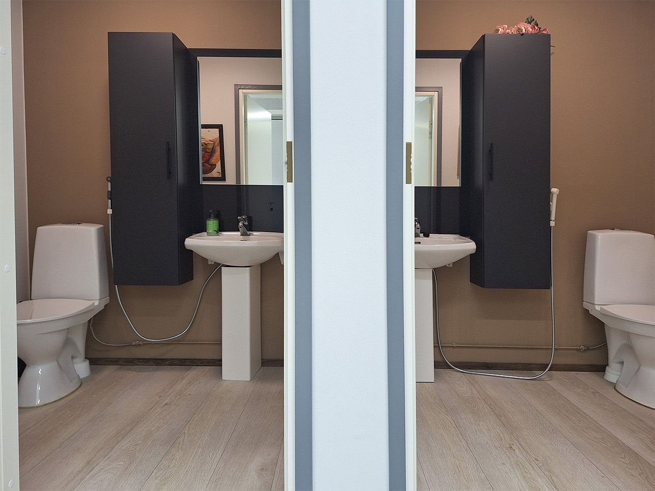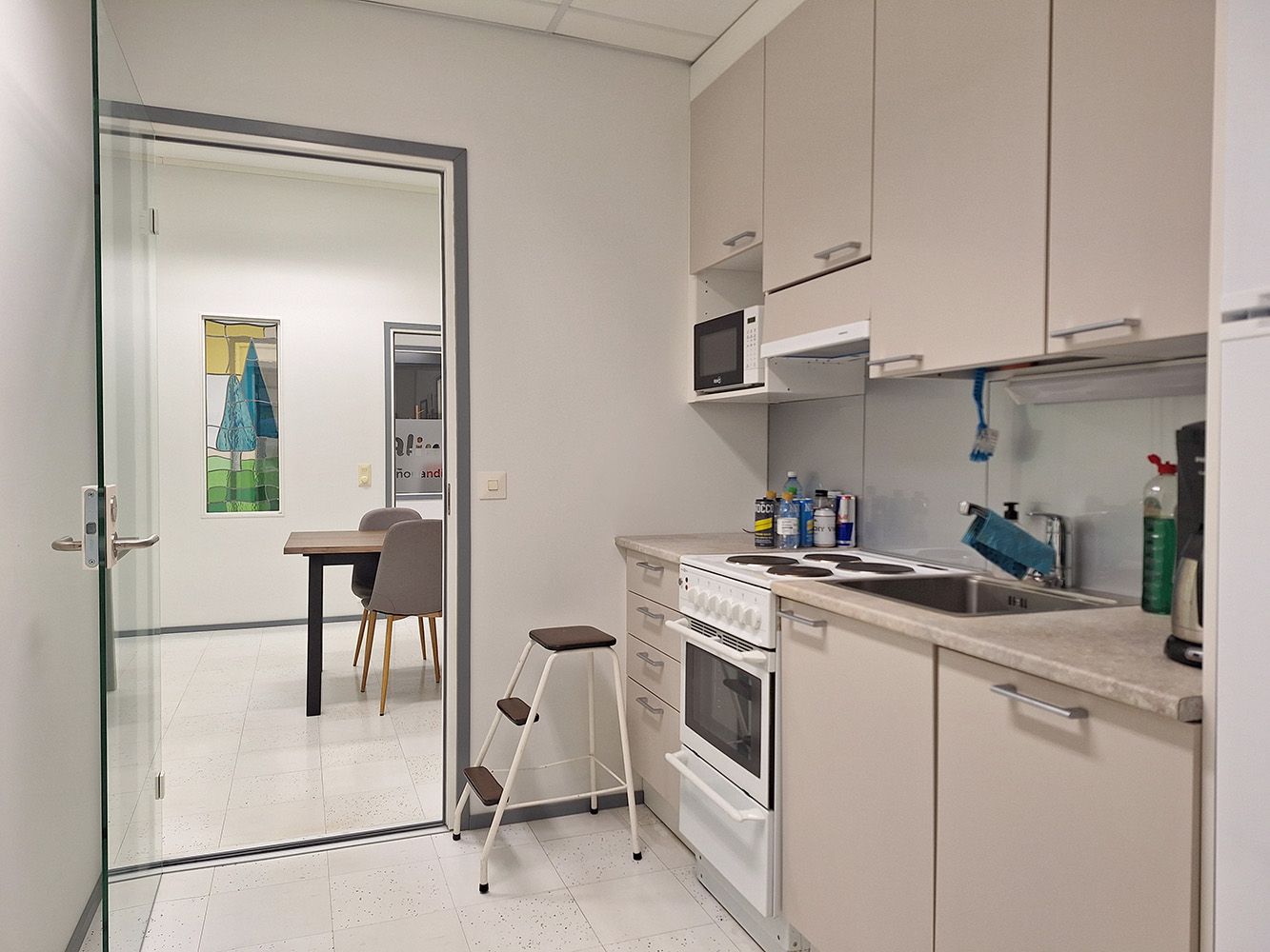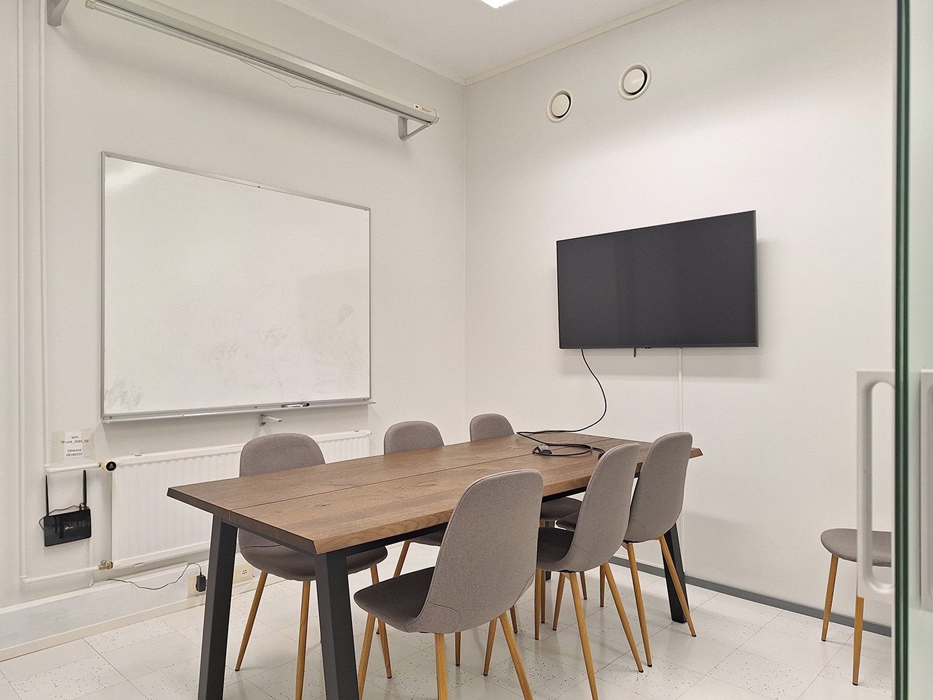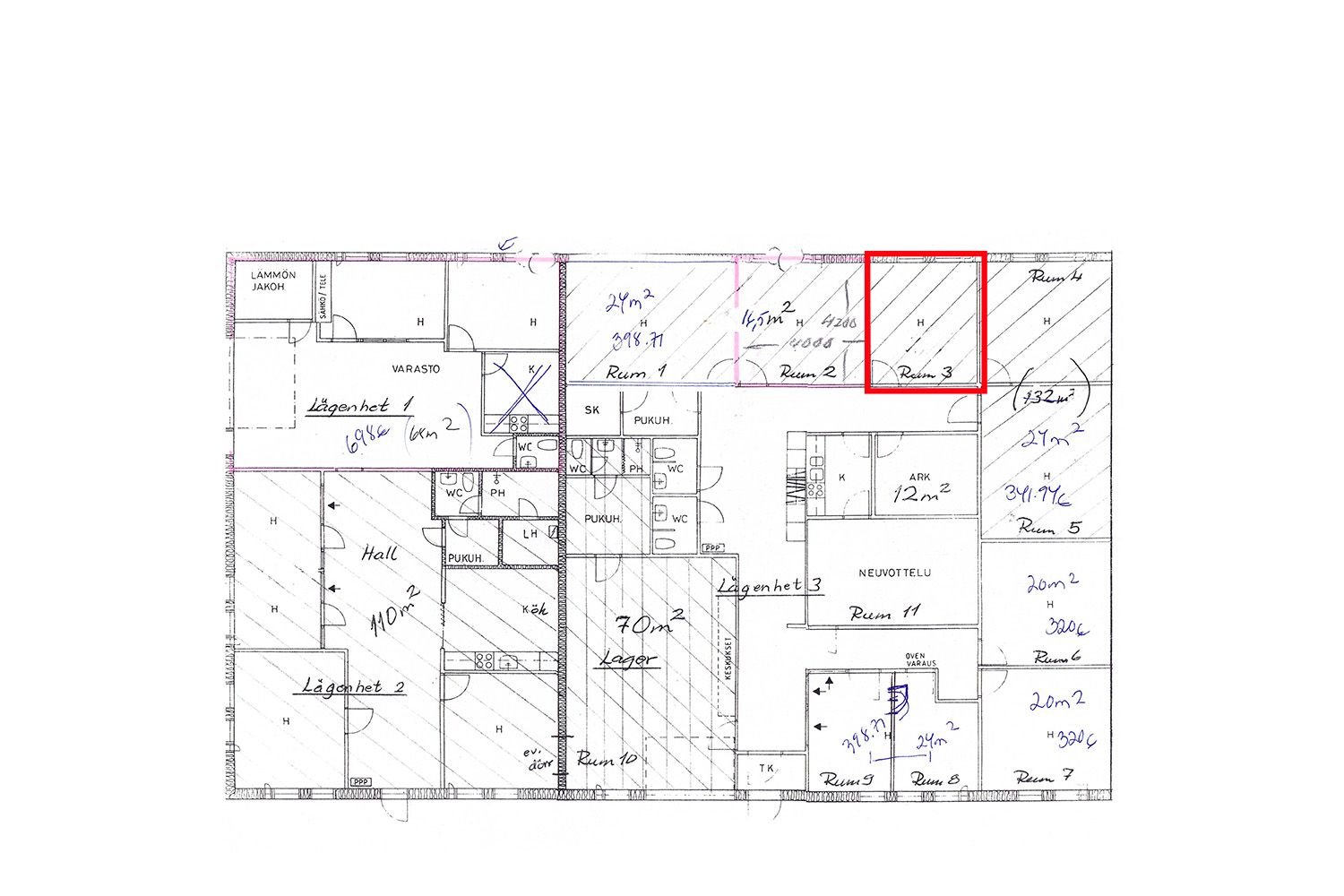 Huone on merkitty pohjakuvaan sinisellä värillä. Vuokralaisilla on yhteiskäytössä hyvin varusteltu keittiö, ruokailu/taukotila, sen yhteydessä oleva, äänieristetty neuvotteluhuone sekä kaksi vessaa. Aula toimii tarvittaessa hyvin vaikka odotustilana.