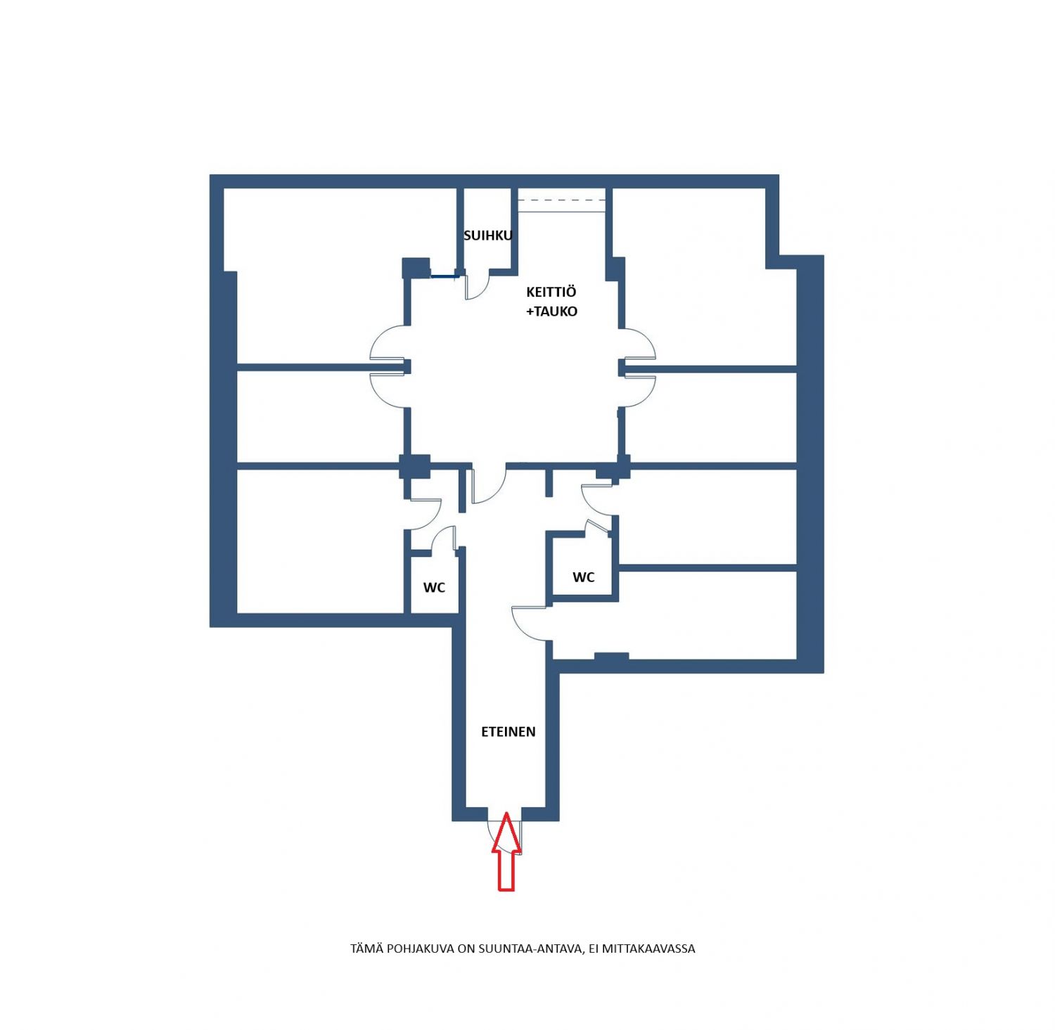 Tilaan tultaessa on vastassa pitkänmallinen ja tilava eteinen. Huoneiston molemmilla seinustoilla on yhteensä seitsemän huonetta. Tilan keskellä on hyvänkokoinen keittiö-/taukotila.