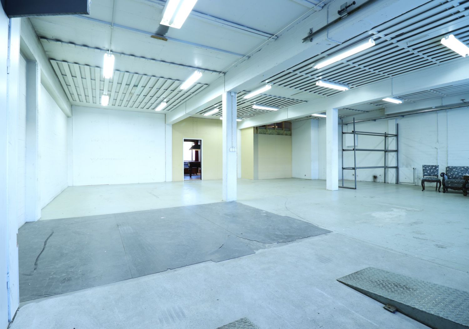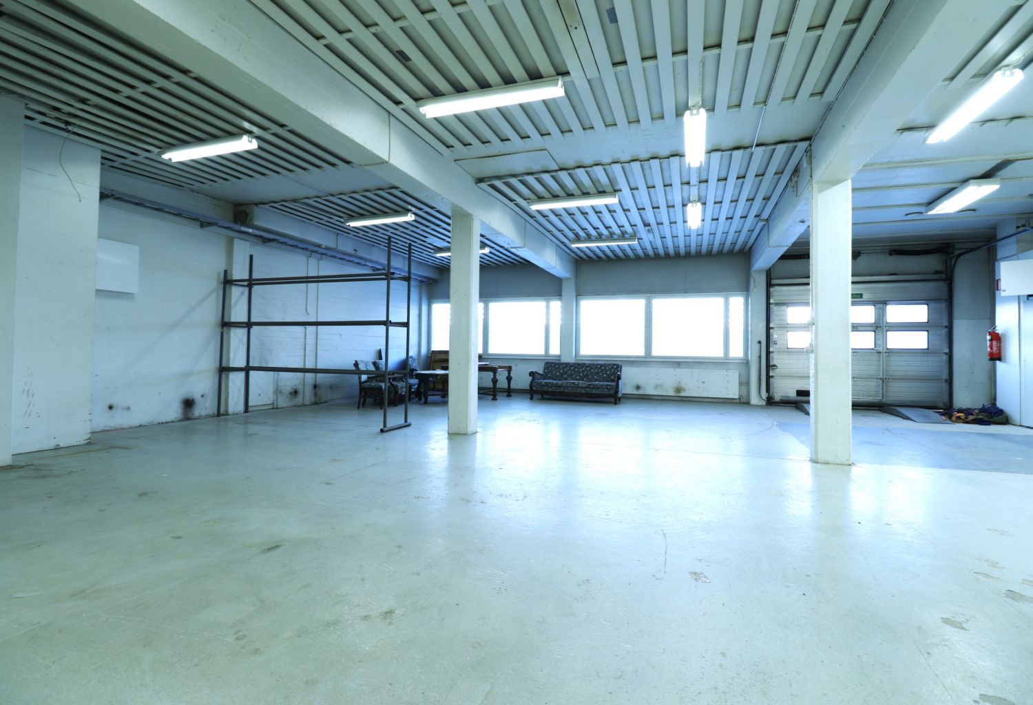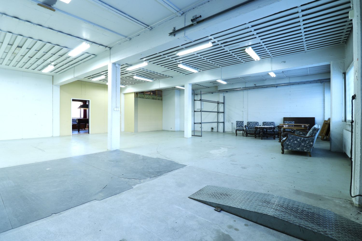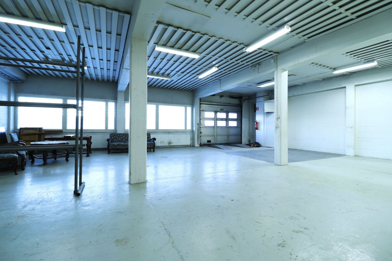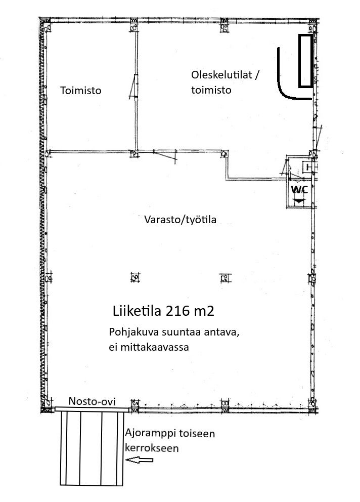 Tämä toisen kerroksen vuokrattava tila koostuu toimisto-osiosta, jossa tällä hetkellä isompi avotila/olohuone sekä erillinen iso toimistohuone ja wc. Lisäksi tilassa on väliseinällä erotettu varastoksikin kelpaava nosto-ovellinen halli-/työtila, johon on oma ajoramppi sisäpihan puolelta. Tilaan voi ajaa autolla, korkeuden puolesta mahtuu myös pakettiauto.