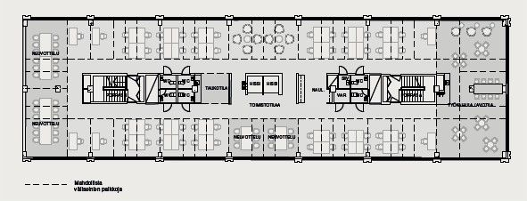Vuokrattavana saneerattua toimistotilaa Kalliosta. Mahdollisuuksia on paljon: monitila-, avo- ja työhuonetoimistot voidaan suunnitella ja toteuttaa jopa sisustusvalintoihin saakka vuokralaisen tarpeiden, toiveiden ja esimerkiksi brändi-ilmeen mukaan. Kiinteistön toimistokerrosten tiloja voidaan avata tai rajata, eli jakaa täsmälleen sopivan kokoisiksi 1–4 vuokralaiselle. Pienimmät vuokrattavat toimitilat ovat pinta-alaltaan 150 neliötä ja suurimmat, koko kerroksen kattavat tilat, 650 neliömetriä. Myös eri kerroksissa sijaitsevien tilojen joustava yhdistely onnistuu.
