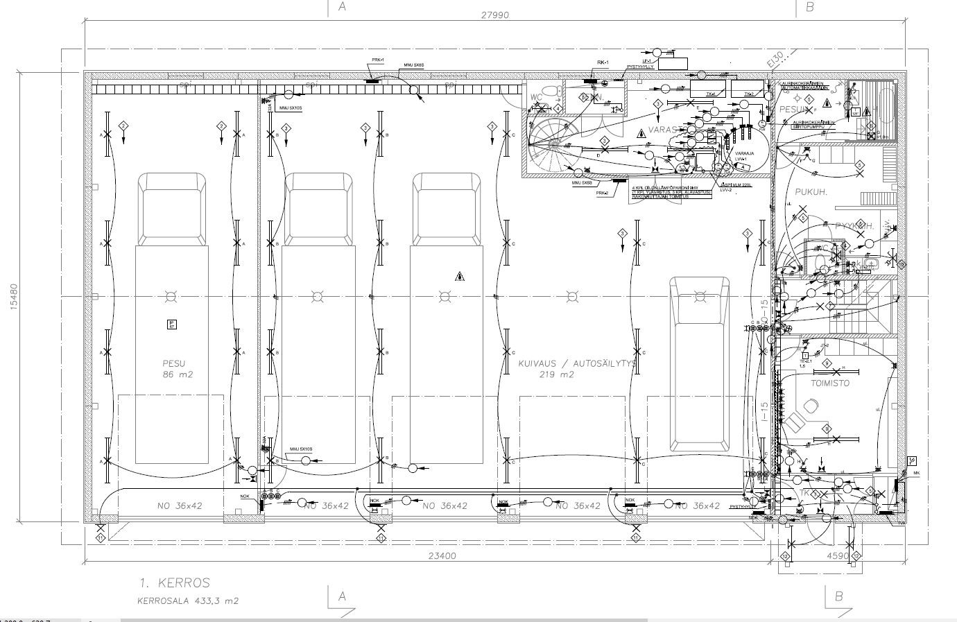 Hallirakennuksessa on teräsrunko, seinärakenteena on Paroc -elementti ja kaikissa lattioissa on Varmia -lattialämmitys.