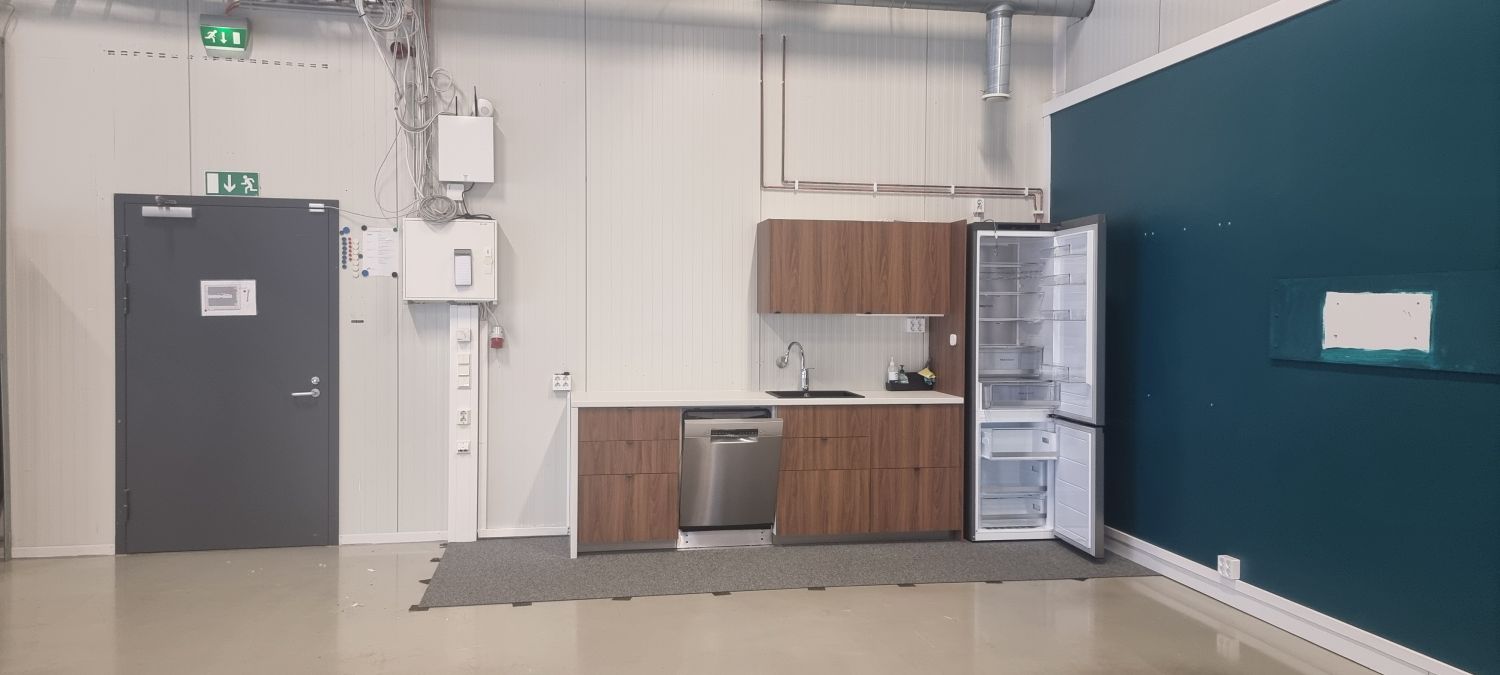 Autolla sisään ajettava tila, nosto-ovi, vesipisteet, voimavirta, öljynerotuskaivo.