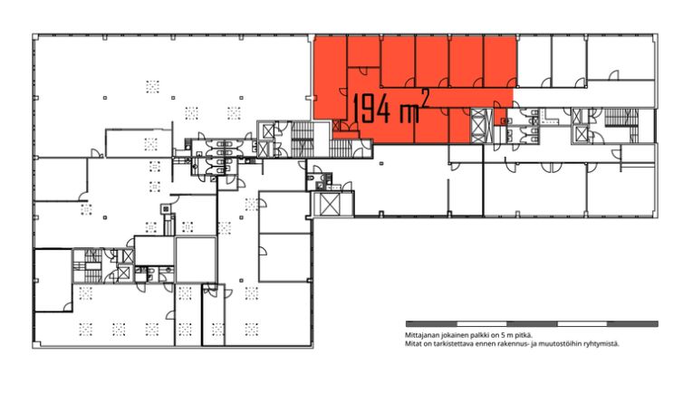 Tämä 194 m² toimistotila sijaitsee kiinteistön 5. kerroksessa. Toimistossa on 6 työhuonetta ja kaksi varastohuonetta. Keittiö- ja wc-tilat ovat yhteiskäyttöiset.