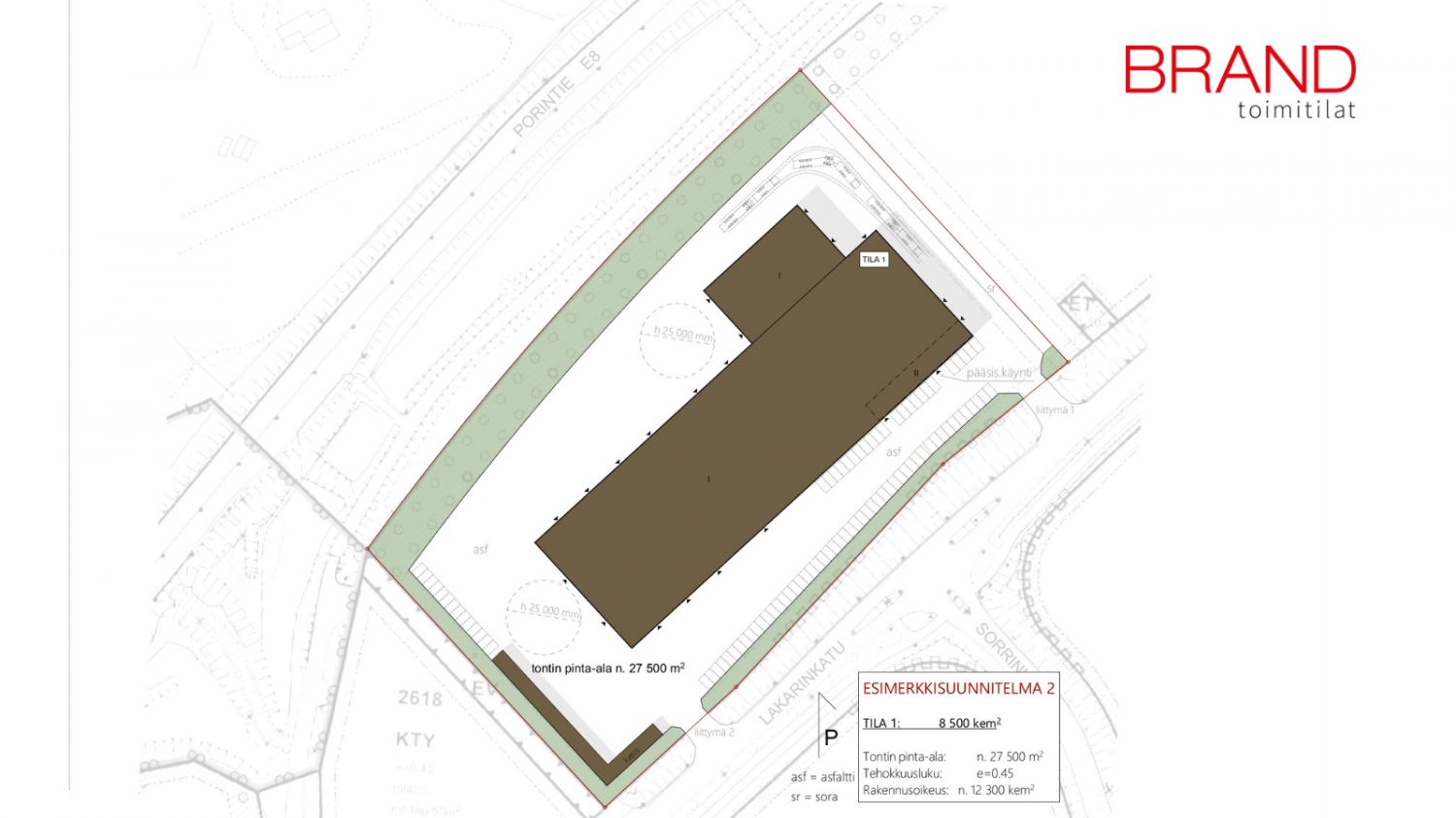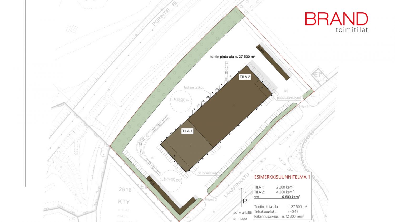 Rakennettava tila on max. 8 500 m². Rakennus voidaan jakaa esim. 2 200 m² ja 4 200 m² yksiköihin, mutta myös muut tilaratkaisut ovat mahdollisia. Rakennus toteutetaan yhteen tasoon ja varustetaan nosto‑ovilla ja muunneltavilla sisätiloilla, jotka palvelevat yrityksesi liiketoimintaa parhaiten.