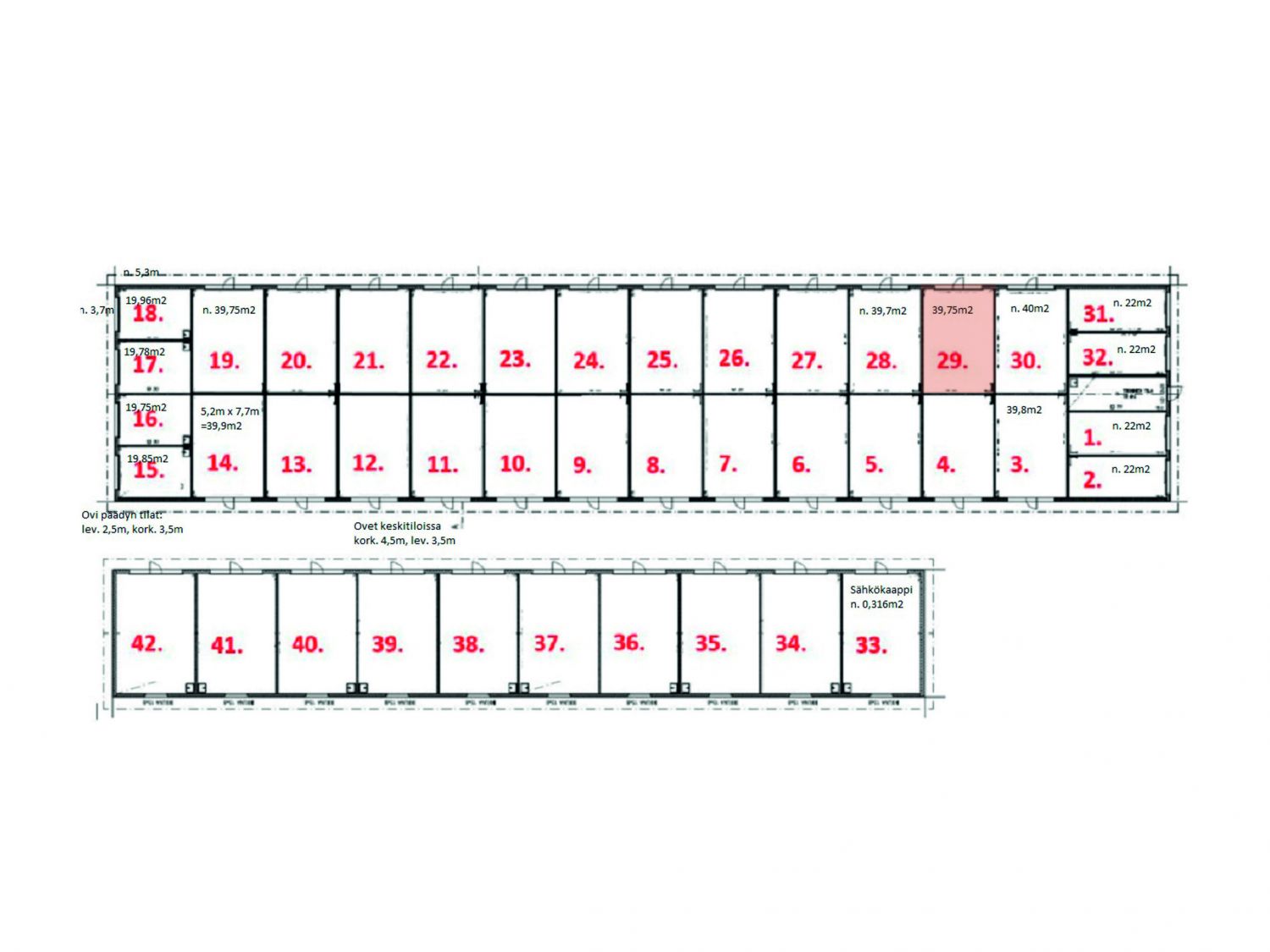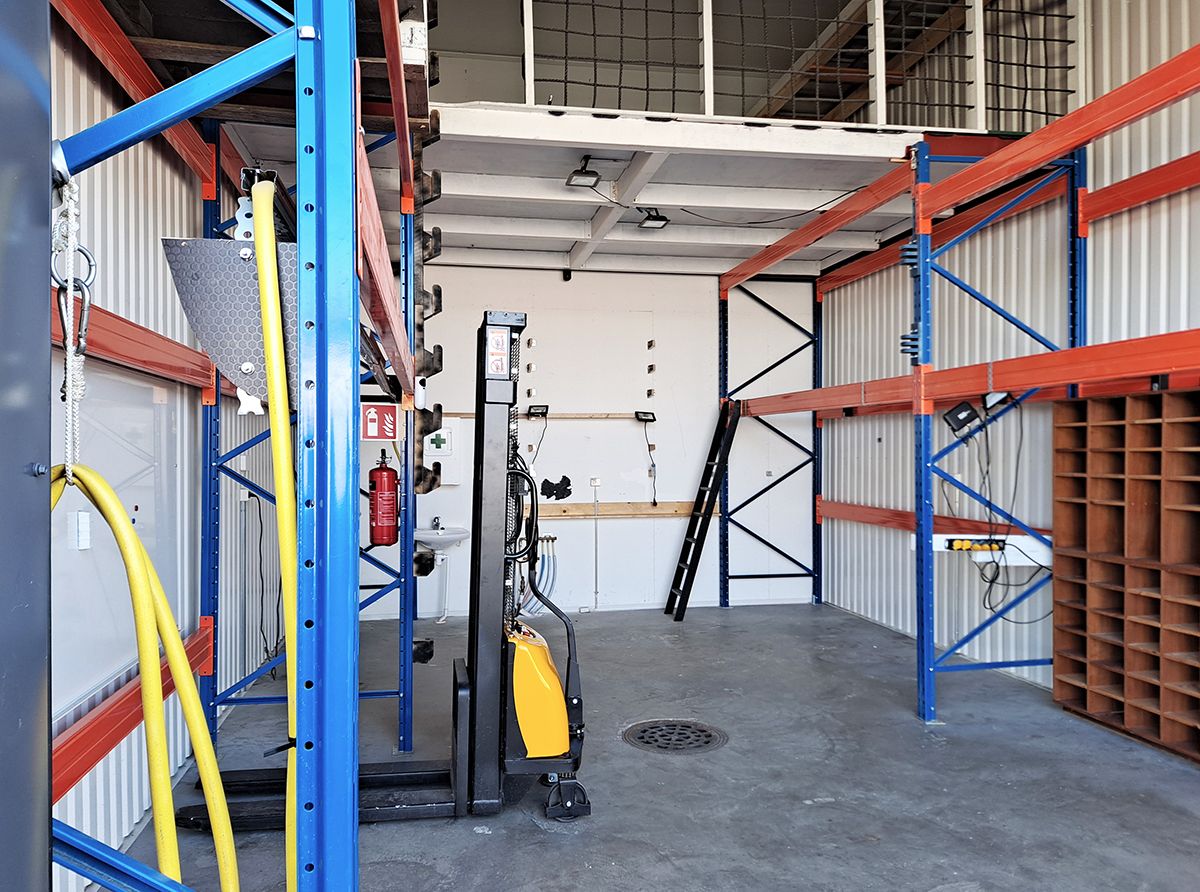 Noin 40 m²:n tilassa on käyntiovellinen nosto-ovi, parvi, hiekan ja öljyn erotteleva lattiakaivo, vesipiste sekä wc- ja suihkuvaraus. Tilan korkeus on noin 5,3 metriä, parven alla 3,5 metriä. Parvelle on hallin perällä tilaa säästävät, kiinteät taittoportaat. Halli on noin 7,5 metriä syvä ja noin 5 metriä leveä. Oven korkeus ääriasennossaan on noin 4,2 metriä ja leveys noin 3,4 metriä. Trukkihyllyt verottavat kuitenkin kulkuaukon leveyttä niin, että niiden kohdalla vapaata kulkutilaa on noin 2,9 metriä.