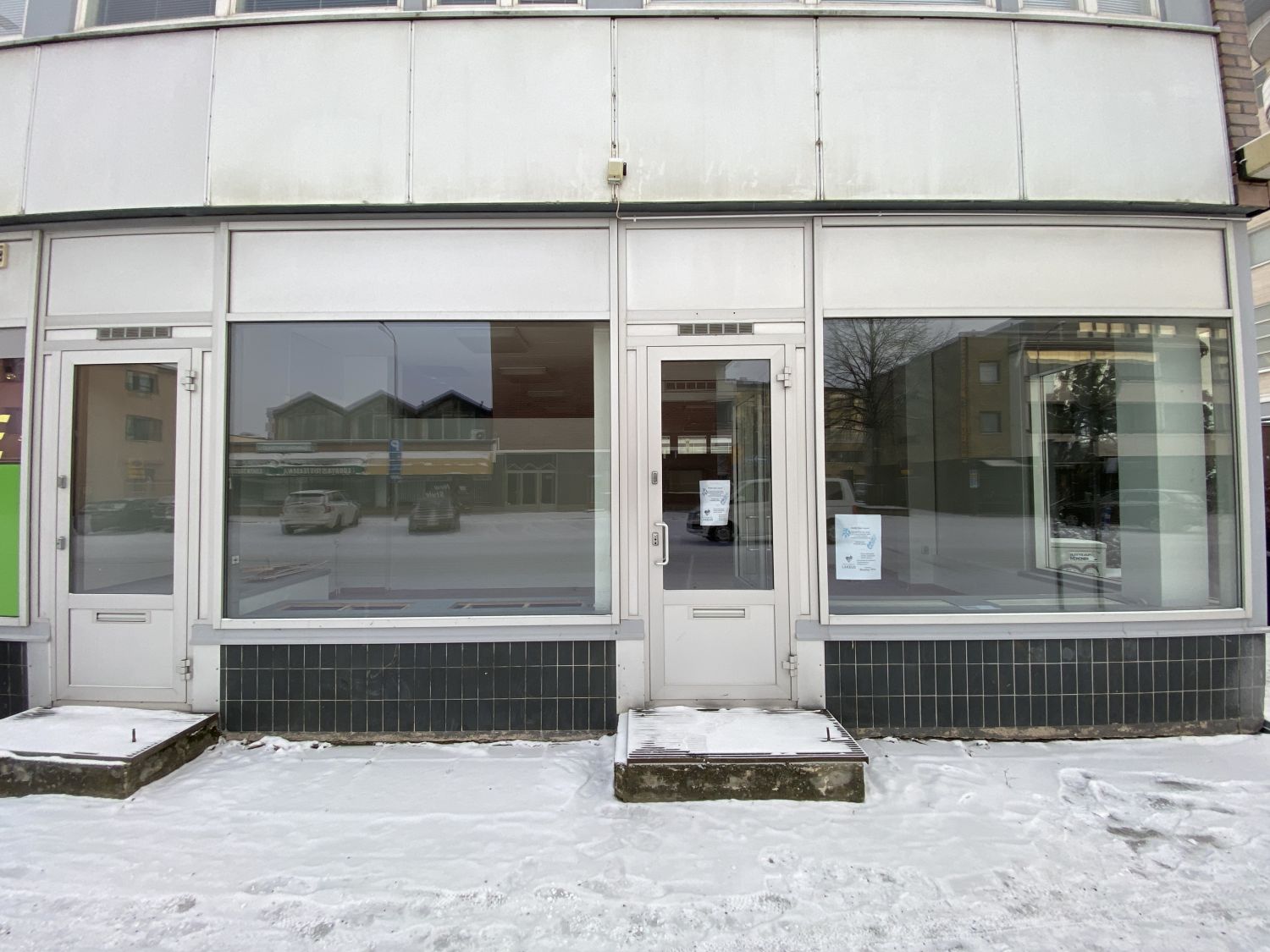 Liiketila rakennuksen kulmassa näkyvällä paikalla.