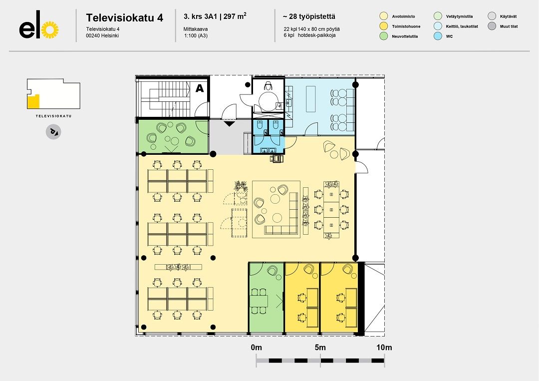 Uudistettua toimistotilaa: Tiloissa mm. tekstiilipalamatot, omat toimivat taukokeittiöt vinyylilankkulattioin, wc:t, energiatehokas led-valaistus.