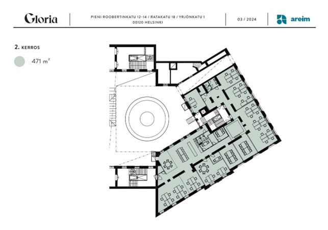 Glorian korttelin ytimessä, vahvojen kiviseinien suojissa sijaitsee yksi koko kohteen upeimmista piirteistä: atrium-henkinen sisäpiha, joka kutsuu leppoisaan oleskeluun vehreine istutuksineen ja tunnelmallisine valaistuksineen. Inspiroiva piha toimii koko kiinteistön ihmisten yhteisenä kohtaamis- ja virkistäytymiskeitaana sekä oivallisena paikkana vapaamuotoisemmalle ideoinnille ja työnteolle.