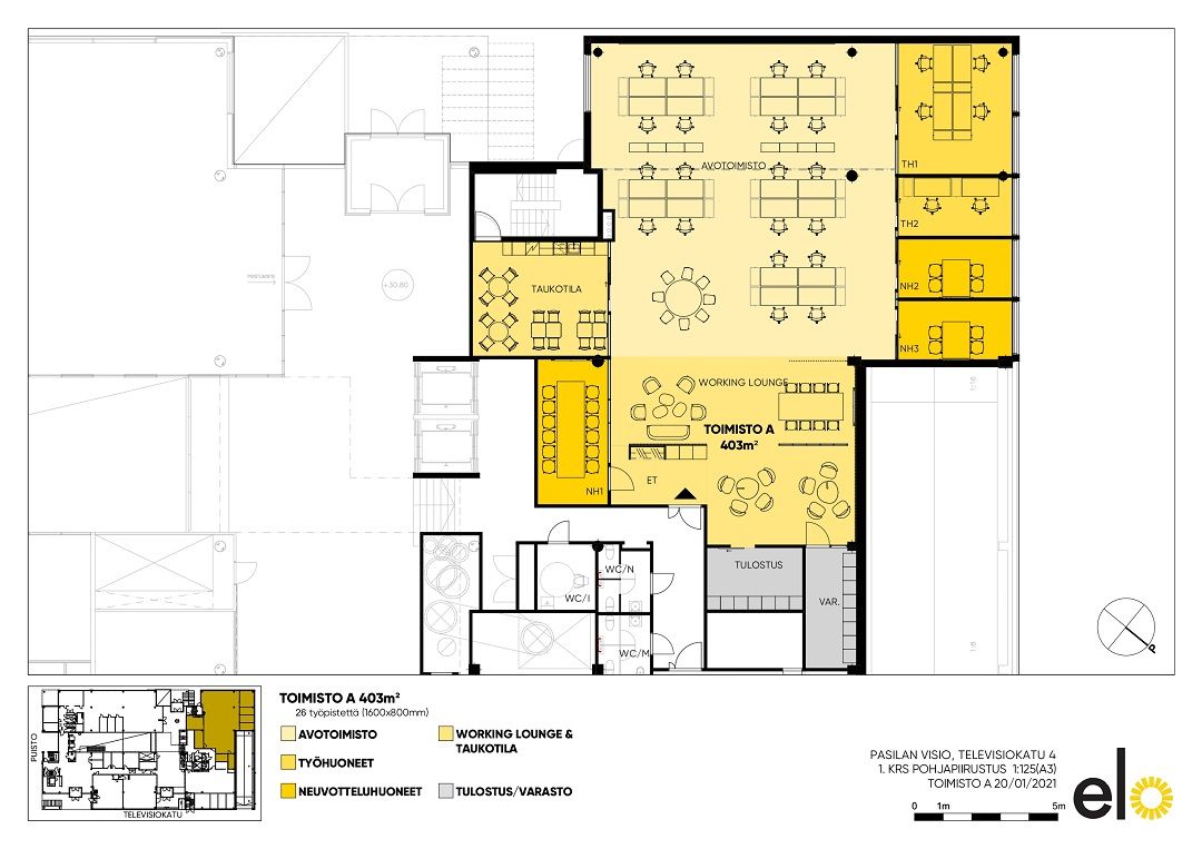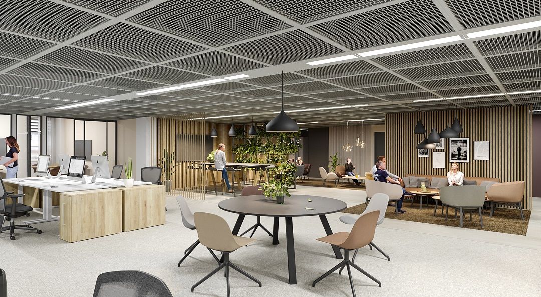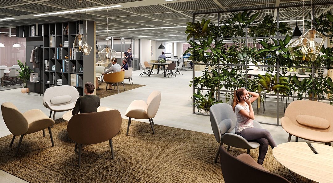 Ensimmäisen kerroksen toimistotila, jossa avotilaa ja muutama toimistohuone.