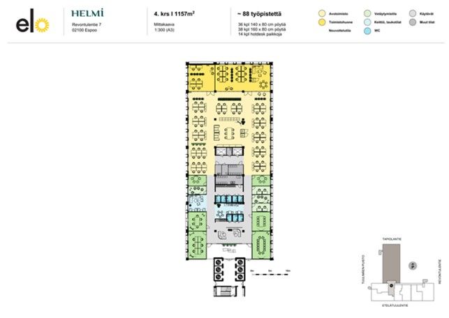 Koko siiven suuri toimistotila jopa 88 työpisteellä. Tilan ikkunat kolmeen ilmansuuntaan, ilman seinänaapureita. Tilassa 6 neuvotteluhuonetta, 4 vetäytymistilaa ja näyttävä cafe/lounge. Tila remontoidaan käyttäjän tarpeiden mukaan.