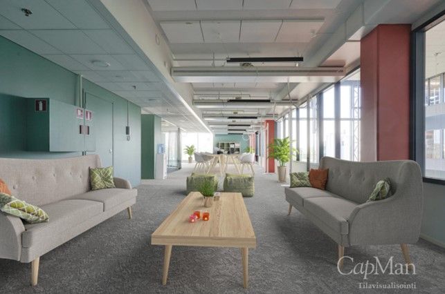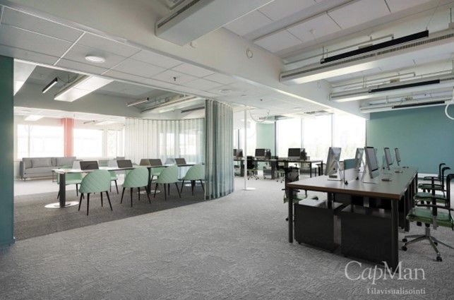 Suuret ikkunat, remontoitu mallihuoneisto (toimisto 269,5 m² + jyvitetty osuus krs-aulasta 4,5 m²