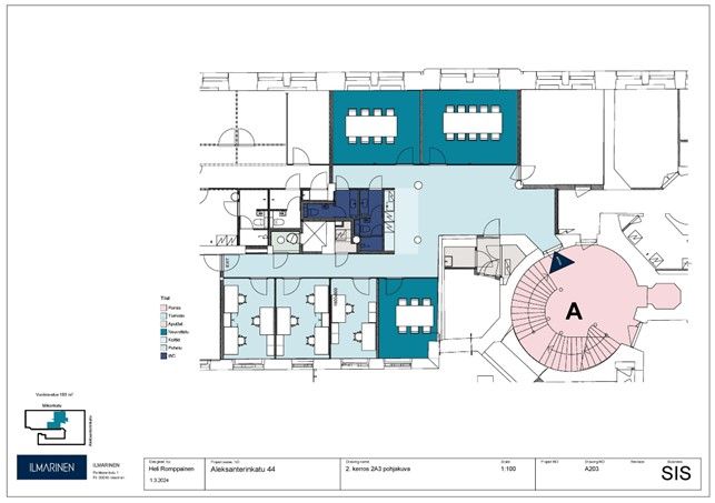 Muuttovalmis kaunis 2. kerroksen toimisto ihastuttavassa Väinämöisenlinnassa Helsingin keskustassa.