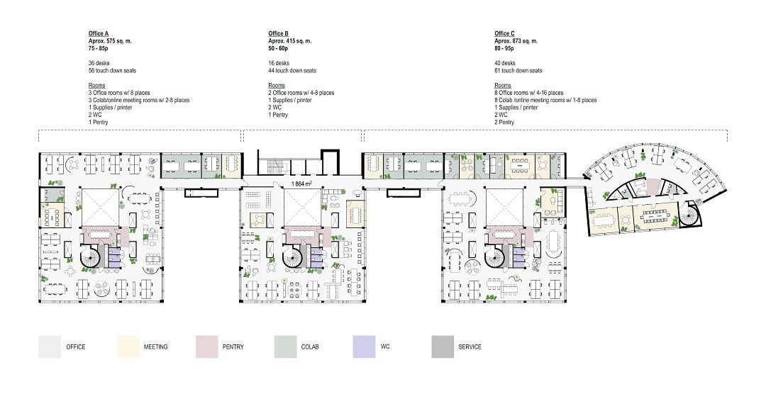 Tämä tila on yhdistettävissä viereiseen 385m2 ja tarvittaessa myös 588m2 tilaan, jolloin kokonaispinta-alaksi muodostuu n. 1849m2.