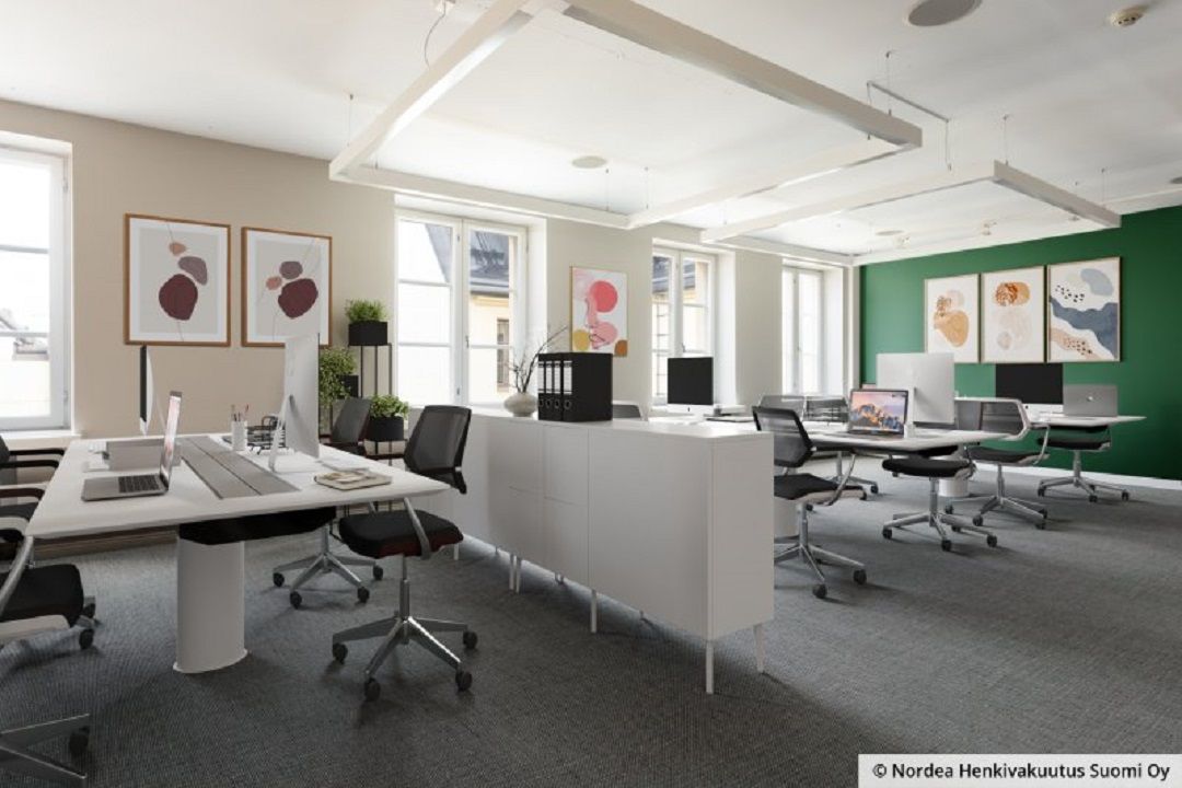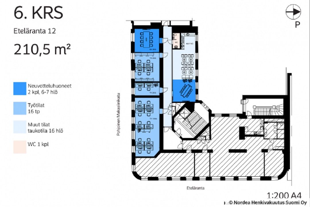 Tämä 210,5m2 toimistohuoneisto sijaitsee kiinteistön 6. kerroksessa, josta aukeaa Pohjoisen Makasiinikadun yli huikea merinäköala. Toimistossa on huoneita, avotilaa sekä omat keittiö-, wc- ja suihkutilat. Tila remontoidaan uudelle vuokralaiselle tarpeen mukaan ja se voidaan myös tarvittaessa jakaa kahdelle eri käyttäjälle.
