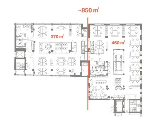 5. kerroksen toimistohuoneisto, joka on tarvittaessa jaettavissa 461m2 / 407,5m2 tiloiksi.