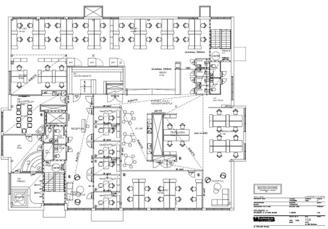 Tässä 4. kerroksen 627m2 toimistotilassa on avotilaa, useita erikokoisia neuvottelutiloja, puhelinkoppeja, työhuoneita, aulatila ja erikoisuutena oma saunaosasto.