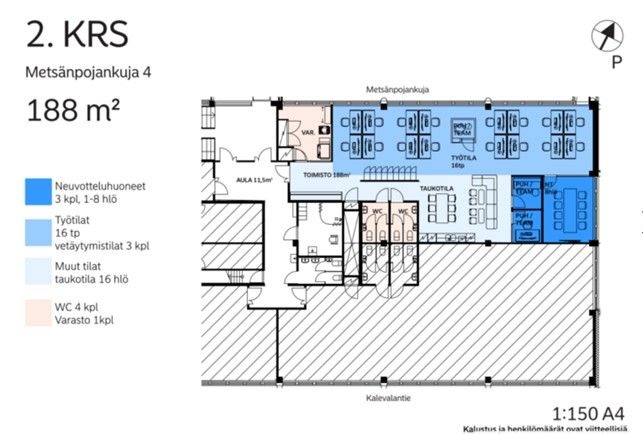Vuokrattavana avotyötilaa ja työhuoneita sisältävä toimisto sujuvalla sijainnilla Pohjois-Tapiolassa. Huoneiston pinta-ala on 188 m². Lisäksi vuokraan jyvitetään 11,5 m² osuus aulan yhteiskäyttöisistä tiloista.