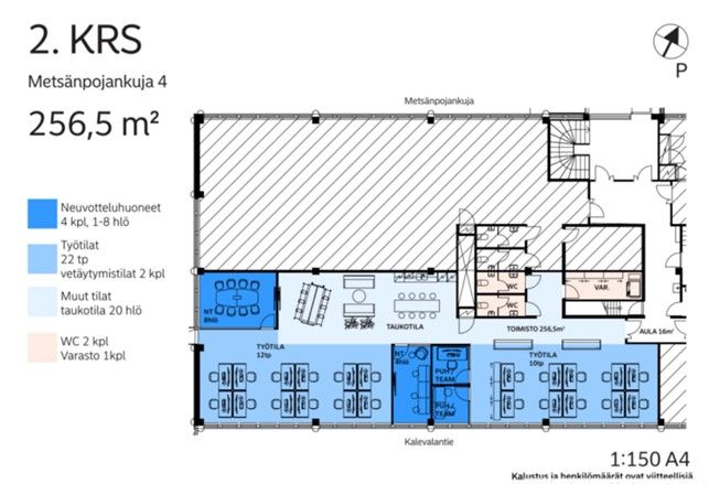 Vuokrattavana toisen kerroksen 272,5 m² avo- ja huonetoimistotila Pohjois-Tapiolassa. Huoneiston pinta-ala on 256,5 m² ja aulan jyvitetty pinta-ala 16 m². Tila voidaan yhdistää viereisten tilojen kanssa isommaksi tilaksi.